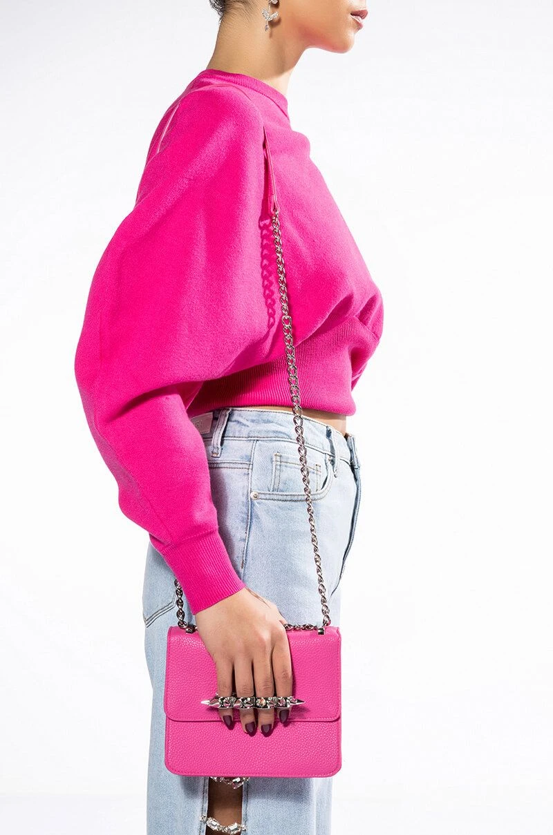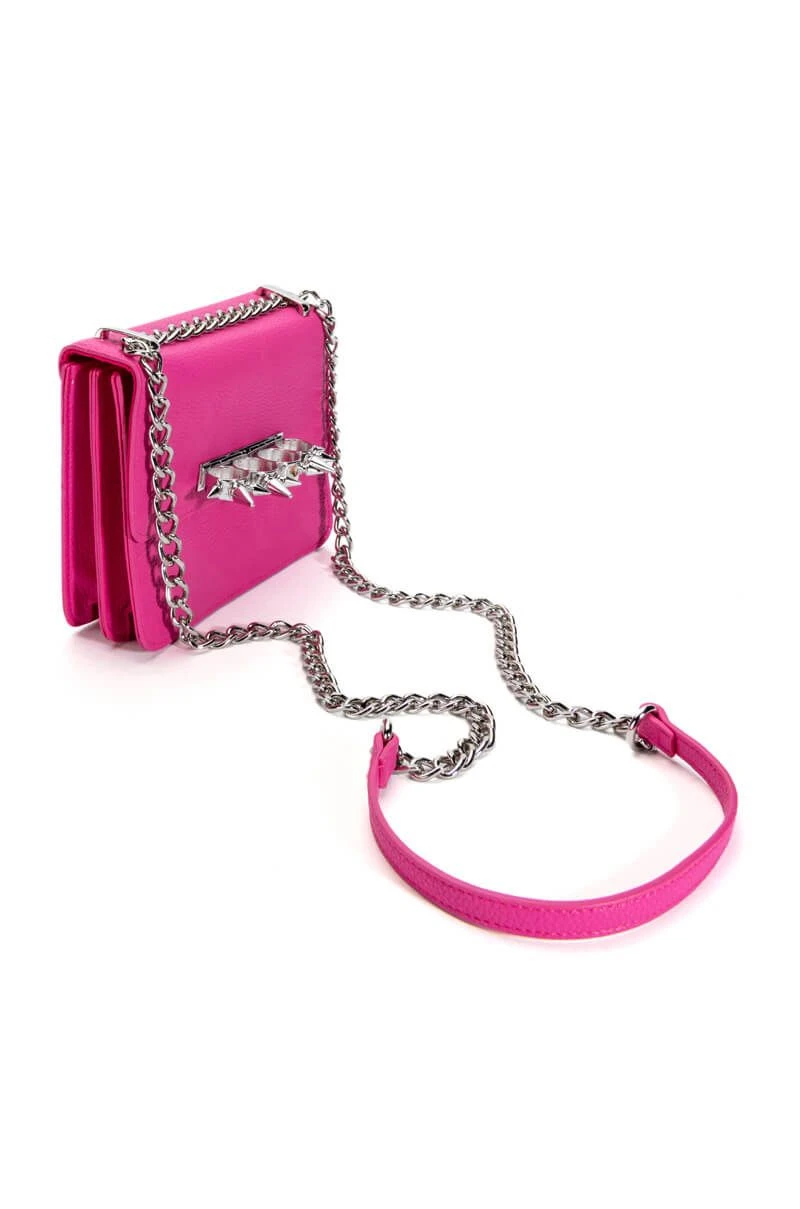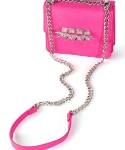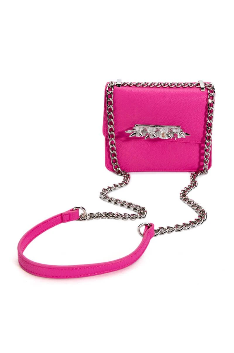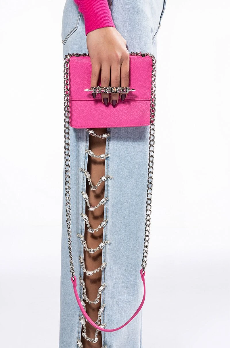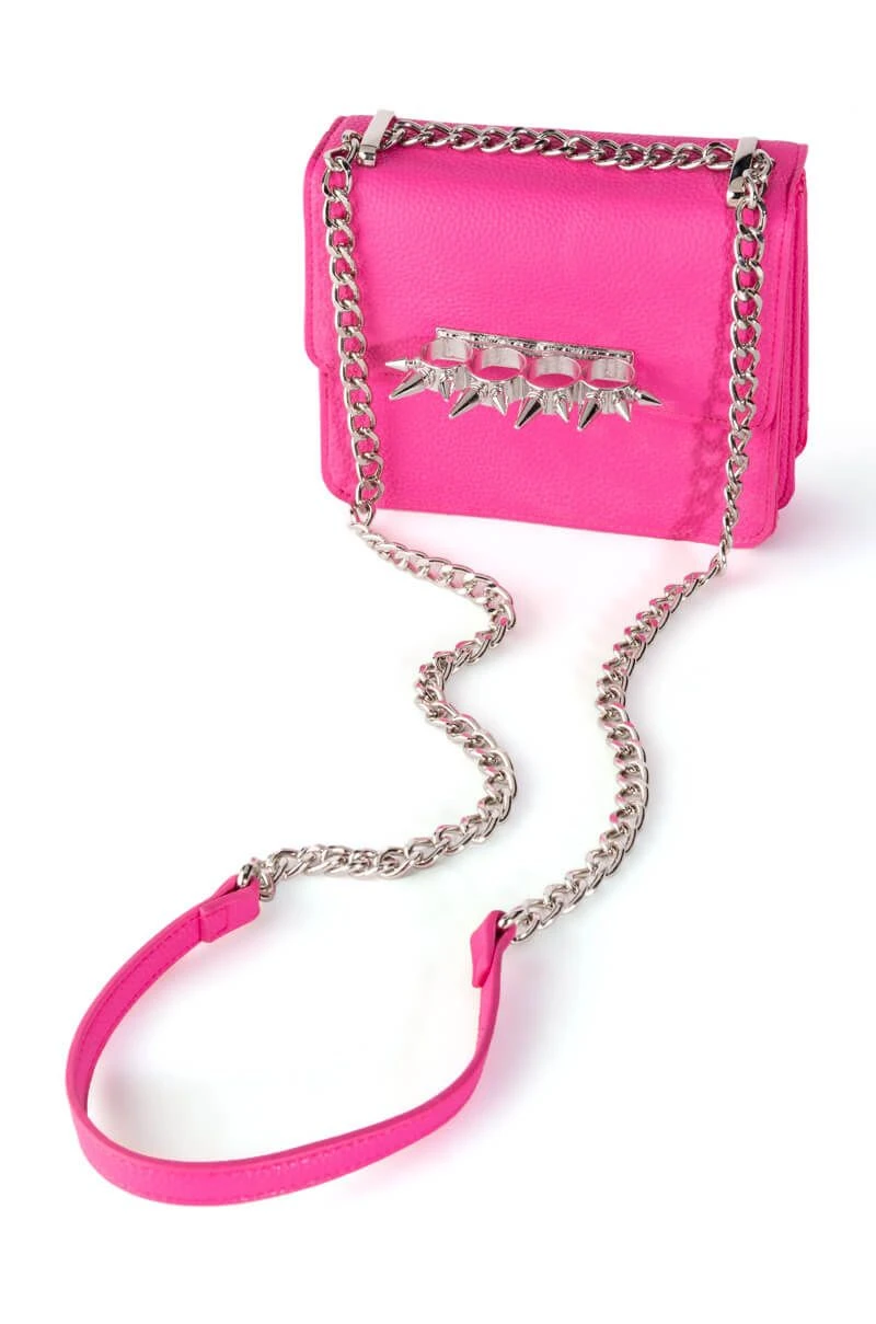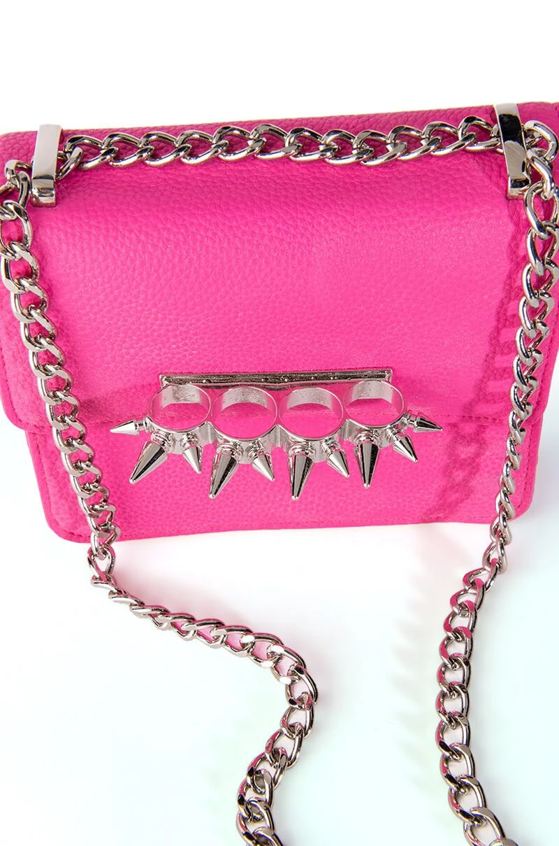 The AKIRA Label Get Lit Pink Knuckle Crossbody Purse is made from a pebbled faux leather fabrication and features a curb chain link and leather crossbody strap, a fierce spiked metal knuckle duster detail, and a front flap. Complete with an inner pocket divided into two sections and a magnetic snap button closure.