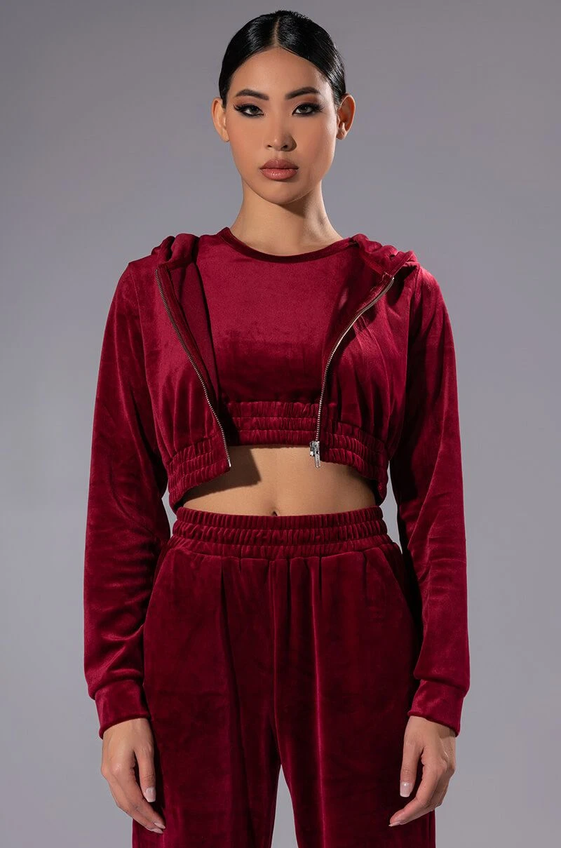 The AKIRA Label Gretchen Zip Up Cropped Hoodie is part of a quintessential athleisure set, and is made from a soft velour fabrication and features a crew neckline, a sleeveless silhouette, ribbed elastic bottom hem, and a pull on fit. Pair this lush piece with the matching The AKIRA Label Gretchen Zip Up Cropped Hoodie, Gretchen Straight Fit Joggers, and chunky sneakers to complete your fetch look.