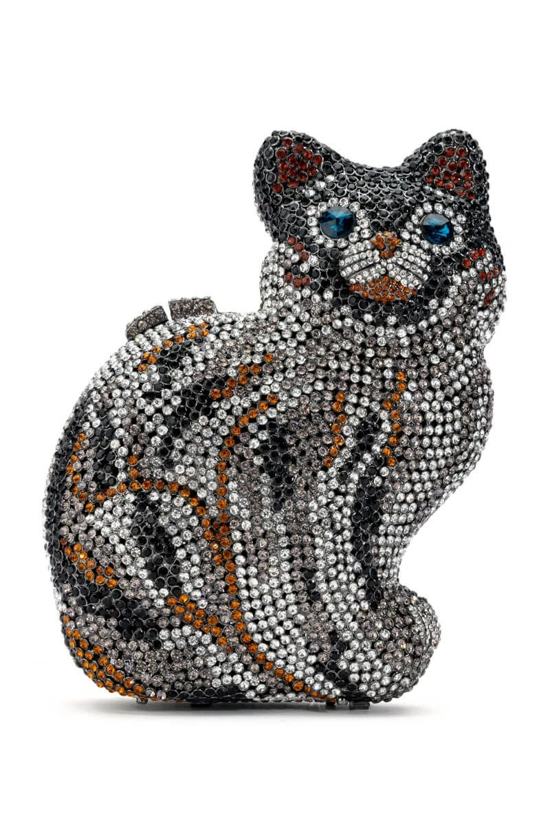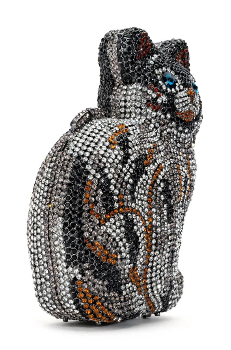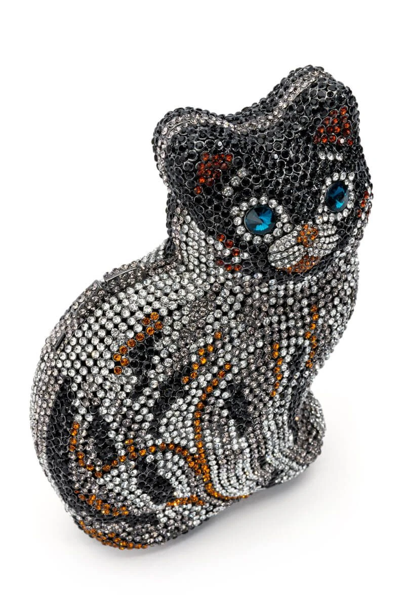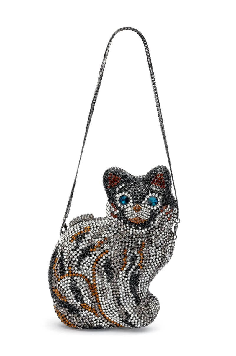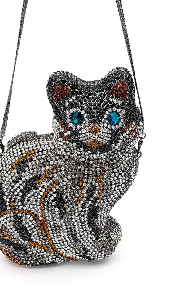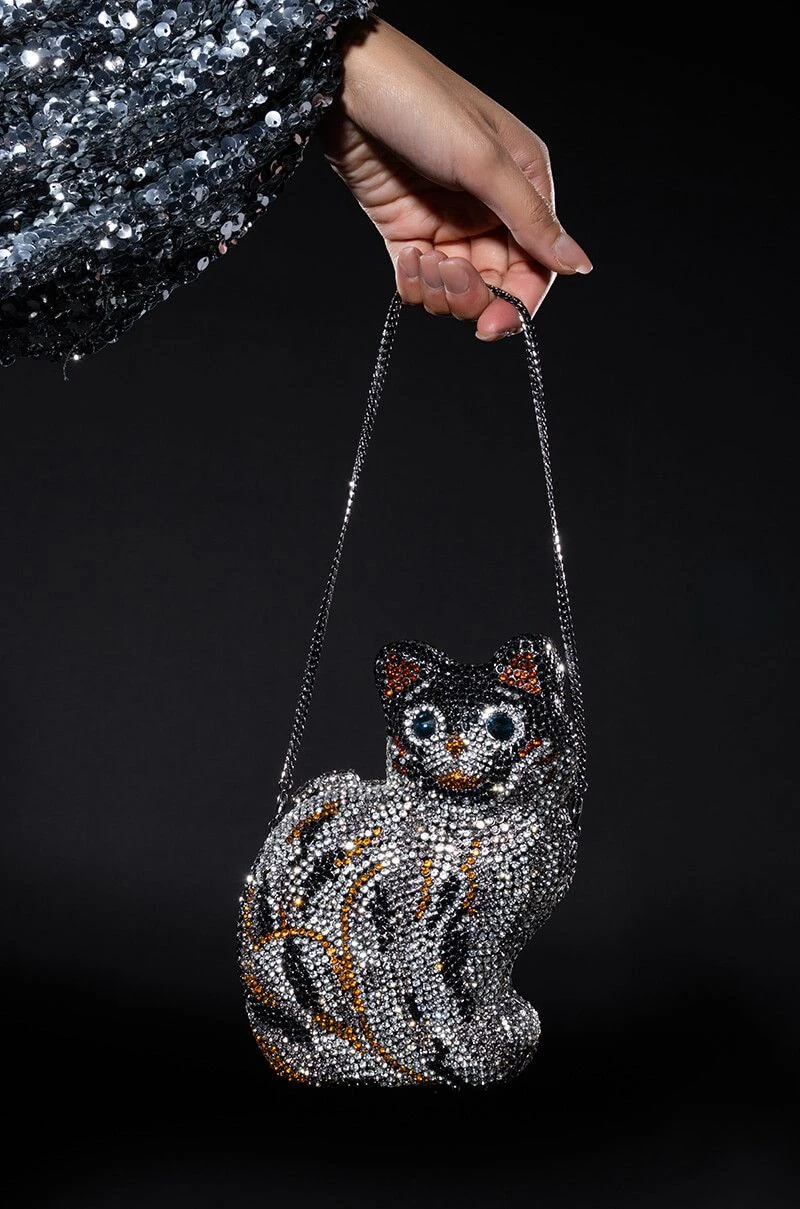 The AKIRA Label Here Kitty Kitty Rhinestone Clutch is an ultra glam rhinestone-embellished handbag shaped like a cute cat. Complete with a push lock magnetic closure, a metallic faux leather lining, and two individual, removable chain straps.