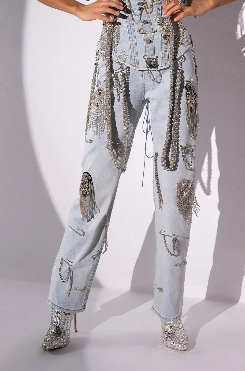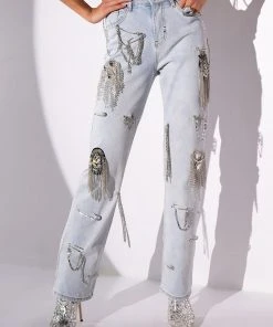 The AKIRA Label Houdini Embellished Wide Leg Jean features a structured denim fabrication, a high rise waist, working belt loops, a classic five-pocket design, a straight leg silhouette, and rhinestone chain link-embellished detailing across the front. Complete with a safety pin motif, draped detailing, studded accents, and a button and zipper closure. Pair with the coordinating AKIRA Label Houdini Embellished Denim Set.