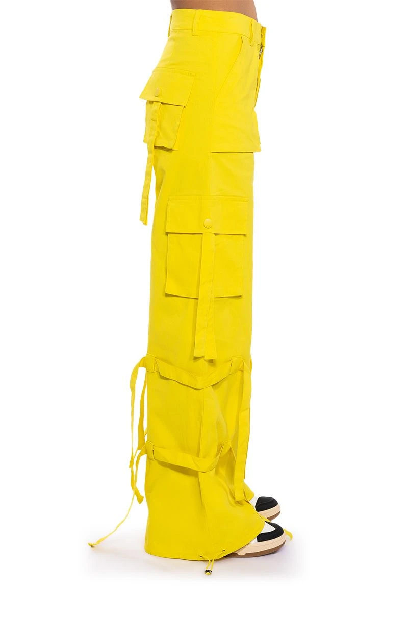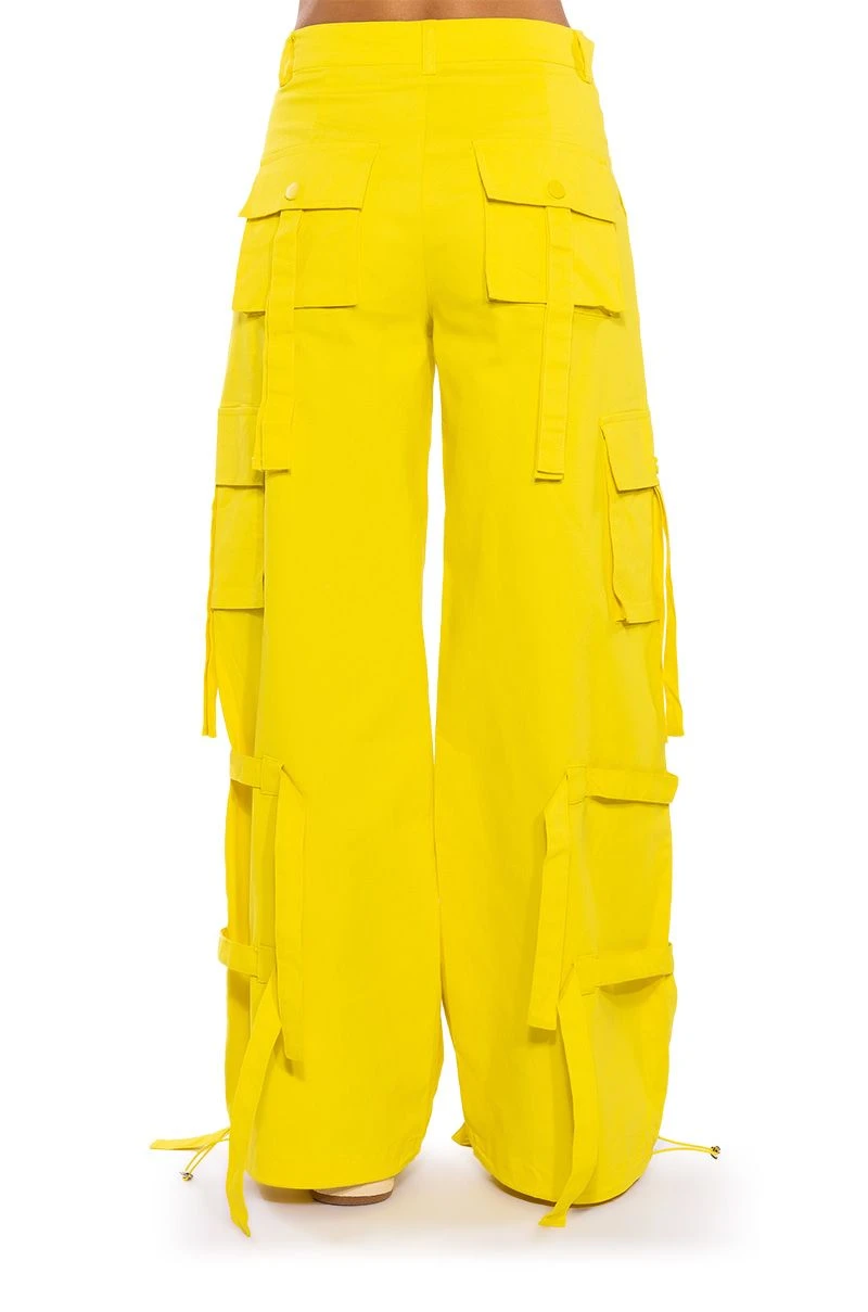 The AKIRA Label It Is Back Cargo Pants are made from a structured cotton fabrication and feature a high rise waist, working belt loops, front patch pockets, tasseled snap button cargo pockets, tie belt detailing, a wide leg silhouette, and toggle drawstring hems. Complete with a button and zipper front closure.
