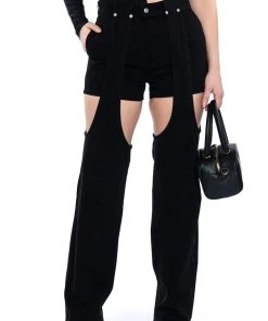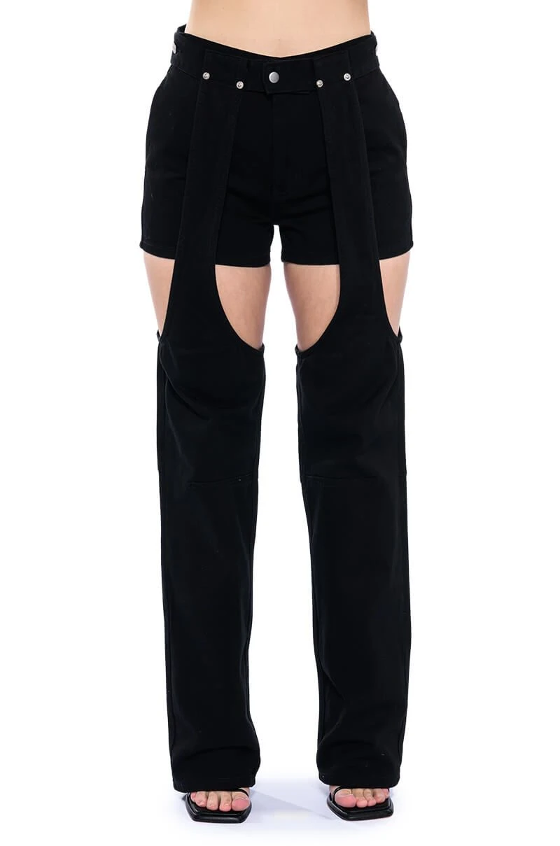 The AKIRA Label Its A Vibe Denim Short And Chaps Jean is made from a structured denim fabrication and features a pair of shorts with a high rise waist, slant side pockets, and a front button and zipper. Complete with attachable, coordinating side button denim chaps featuring a straight leg silhouette and a snap button front closure.