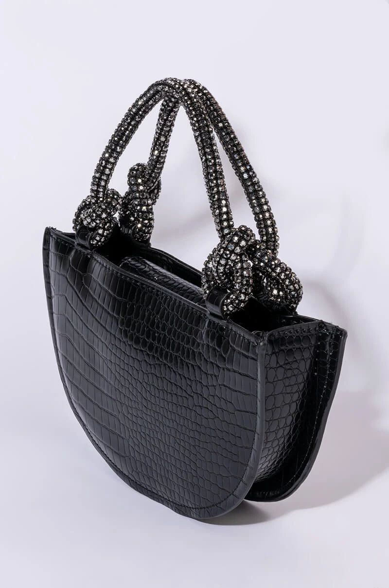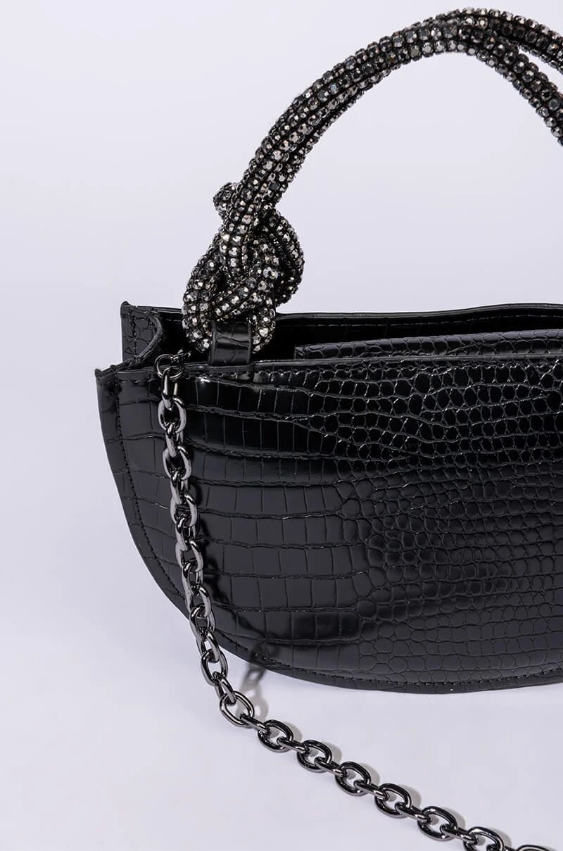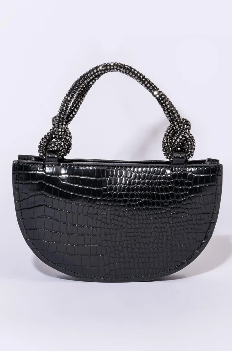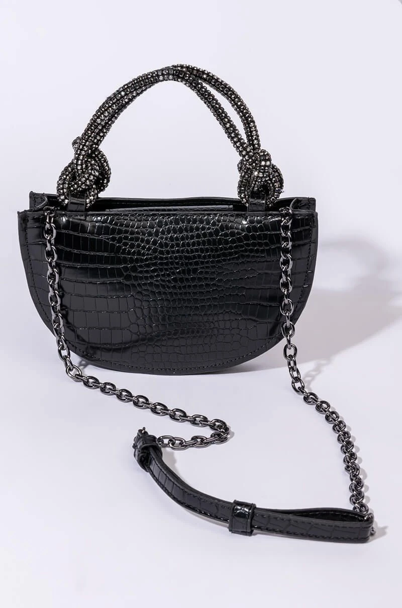 What’ve you got to lose? The AKIRA Label Kiss Me More Semi Circle Purse is made from a faux leather croc base and features knotted rhinestone rope top handles, a semi circle-shaped body, a magnetic snap button closure, and a detachable croc and chain strap.
