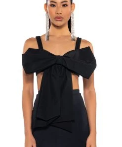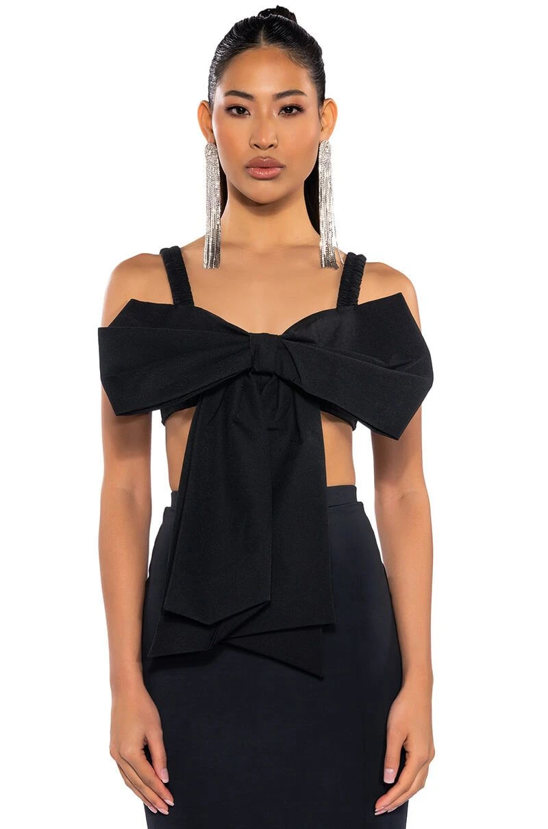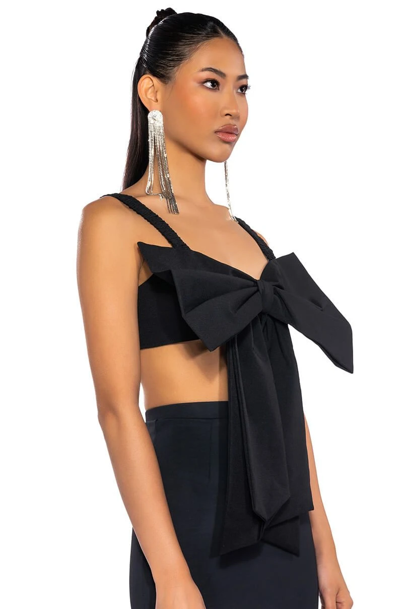 Take your date-night look to the next level with The AKIRA Label Kyle Bow Detail Bralette! This sexy, chic number is a bralette made from a smooth base fabrication, featuring ruched elastic tank straps, a large ribbon bow-tie front, and an inner lining at the cups. Complete with a shirred elastic back and a metallic silver zipper closure. Style with wide-leg dress pants and sleek stilettos for that femme fatale look.