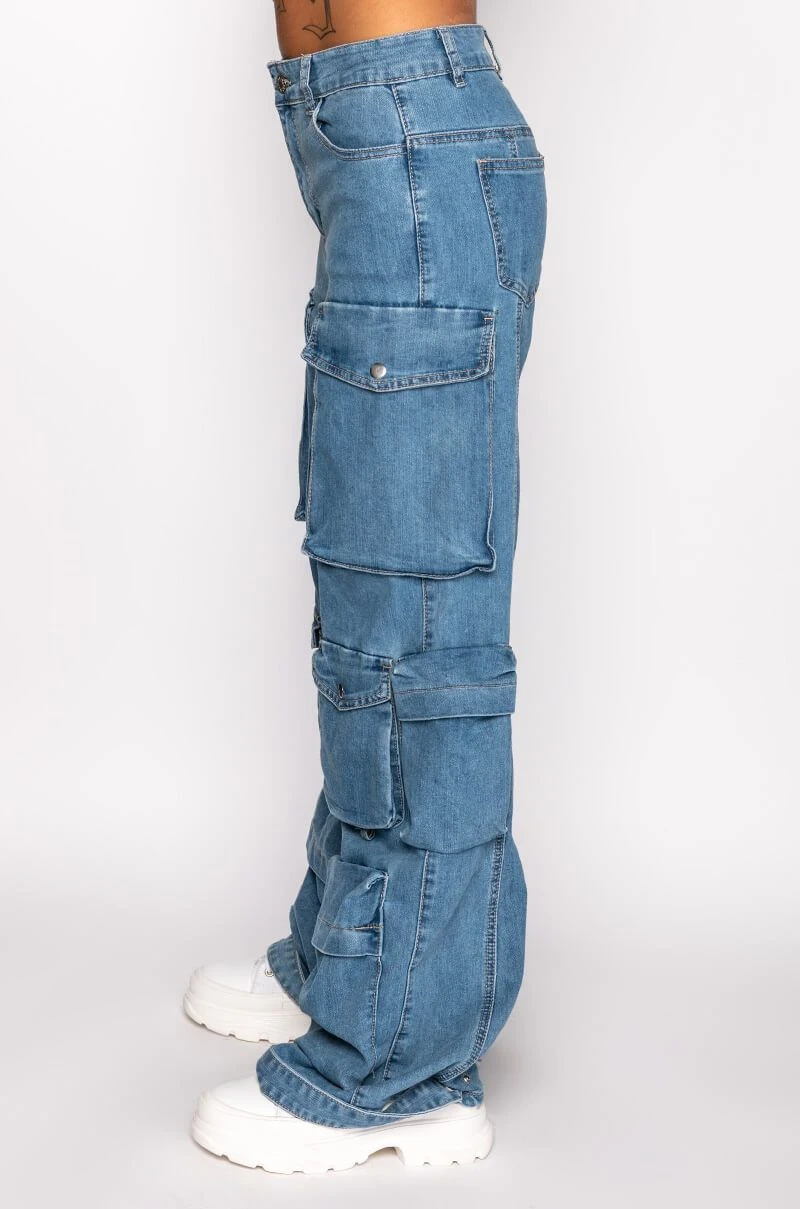 We’re feeling the island vibes in The AKIRA Label La Isla Cargo Jeans! These laid-back bottoms are made from a structured denim fabrication and feature a high rise waist, belt loops, a classic 5-pocket design, large cargo snap button side pockets, a wide leg silhouette, triangular stitching on the inner legs, and denim snap button ankle cinchers. Complete with a classic zip button closure.