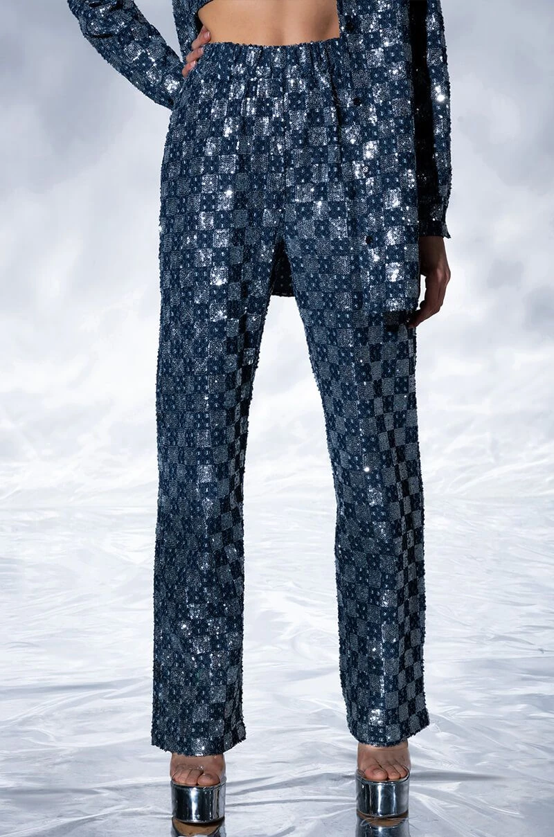 Speaking of glam, The AKIRA Label Leah Wide Leg Trouser is ready to steal the show! These high waisted pants are made with a denim base fabrication, featuring an allover square patchwork sequin design and an elastic band waist. Complete with a wide leg fit, side pockets and a back zipper closure. Pair with coordinating The AKIRA Label Leah Bandeau Crop Top, Leah Oversized Button Down Blouse, and heels to complete this effortlessly flawless look!