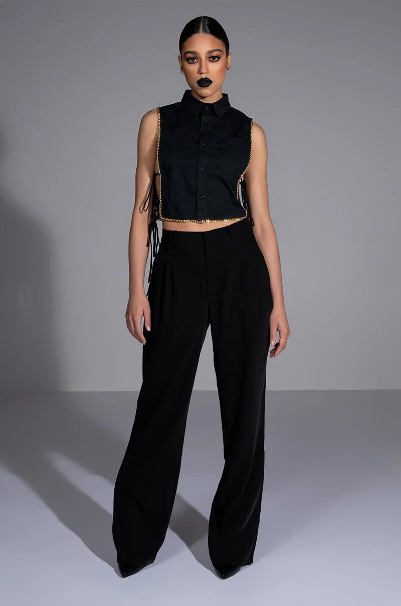 The AKIRA Label Logan Wide Leg Trouser In Black is made from a slick, lightweight fabrication and features a high rise waist, a wide waistband, working belt loops, slant side pockets, pleated stitching, jetted back pockets, and a wide leg silhouette. Complete with a double clasp and zipper front closure. Pair this suited-up piece with a mock neck top and pumps to complete your tailored look.