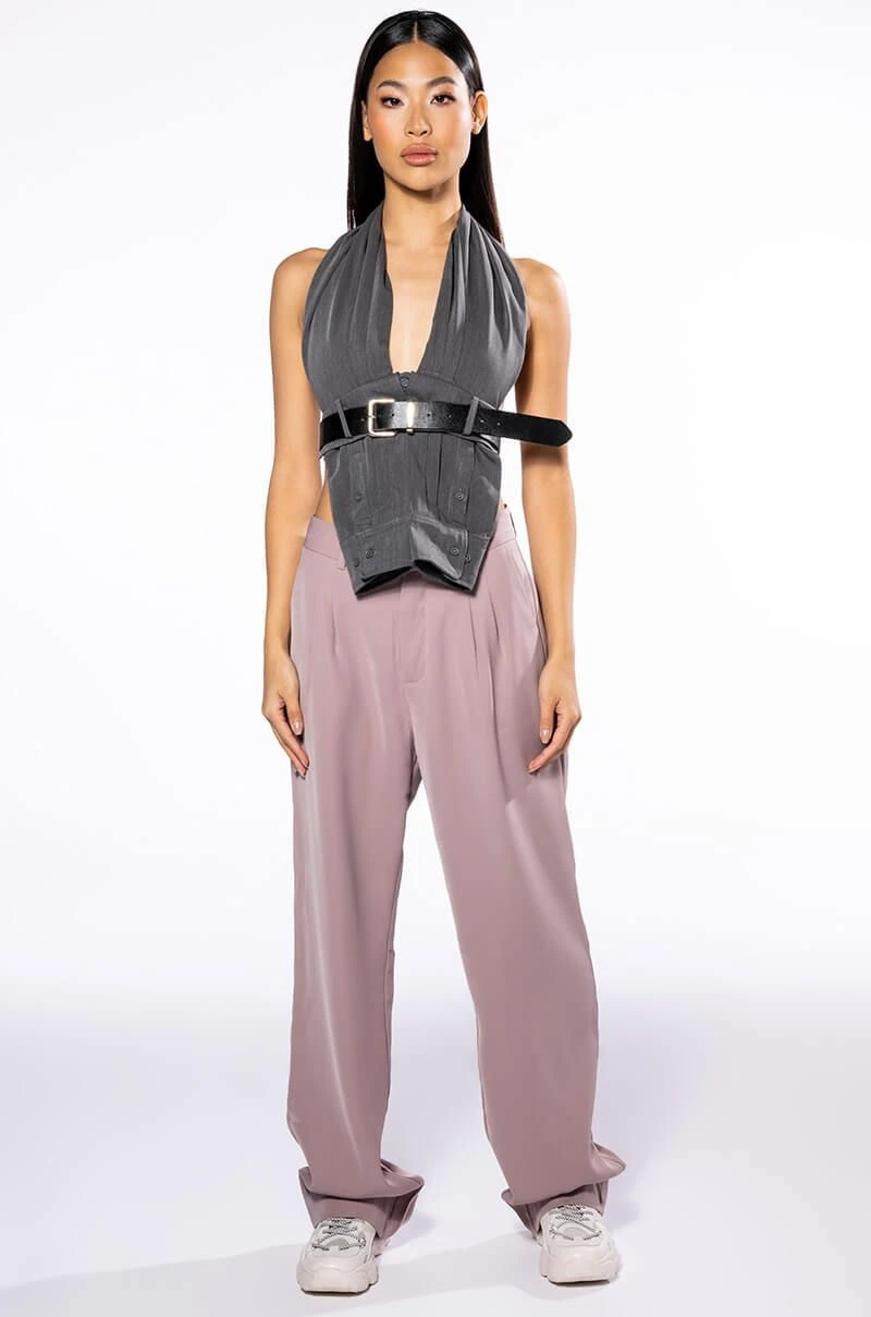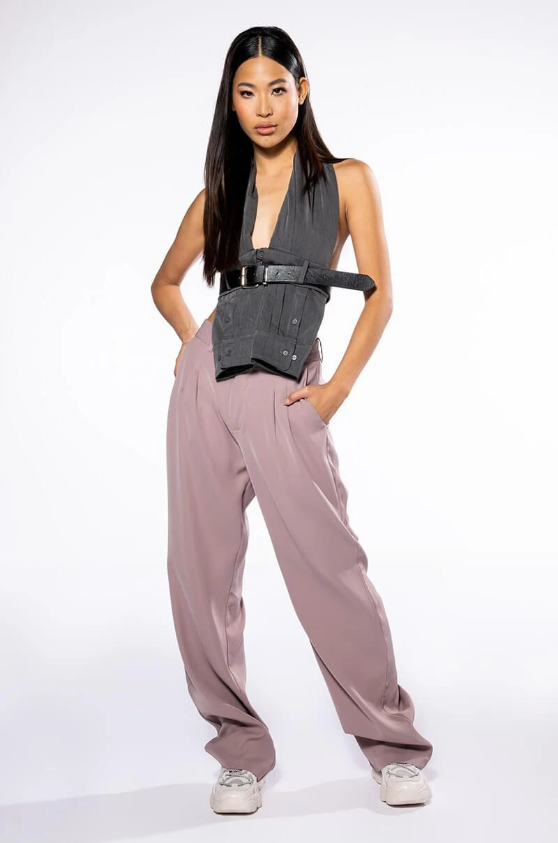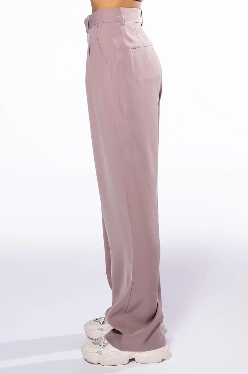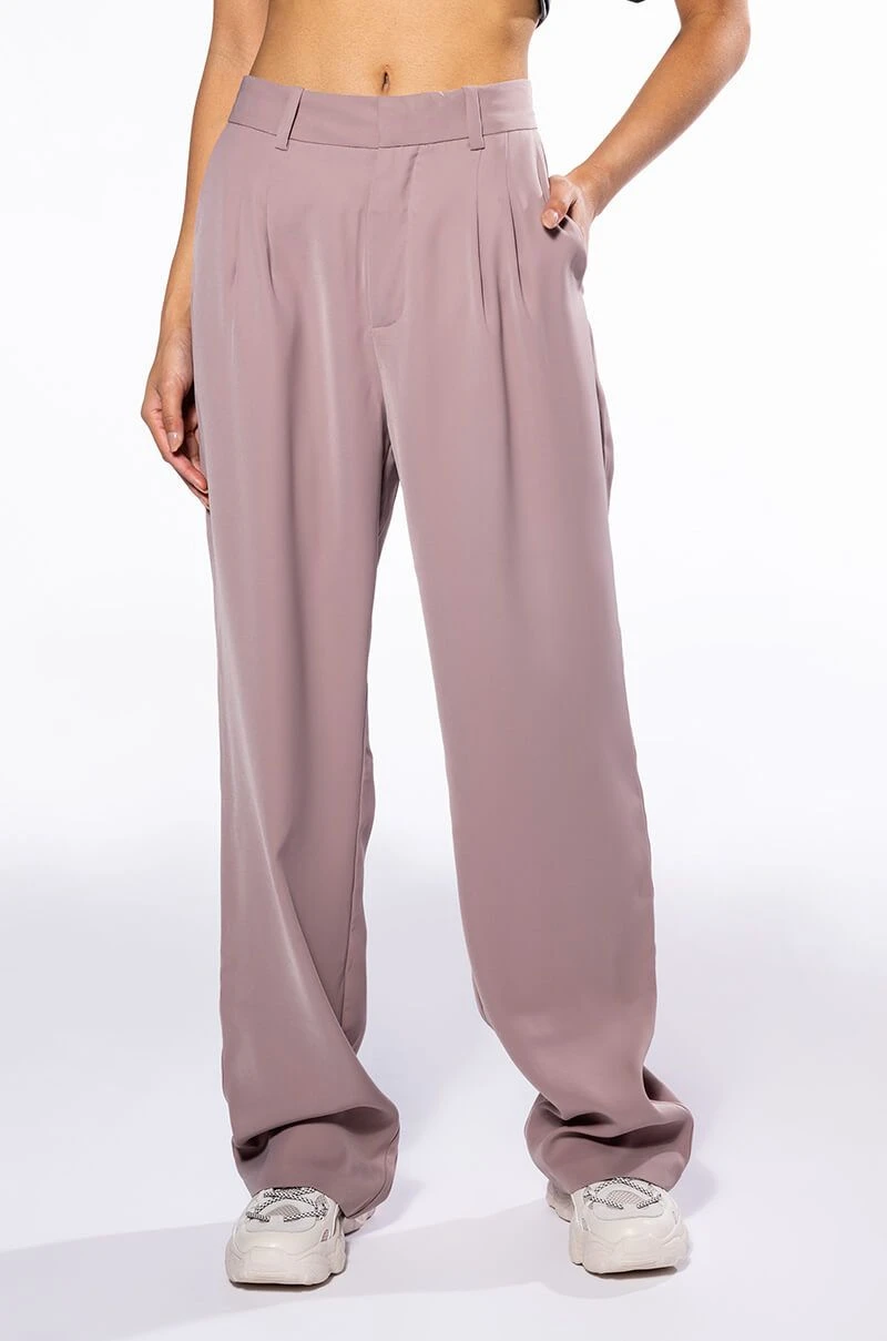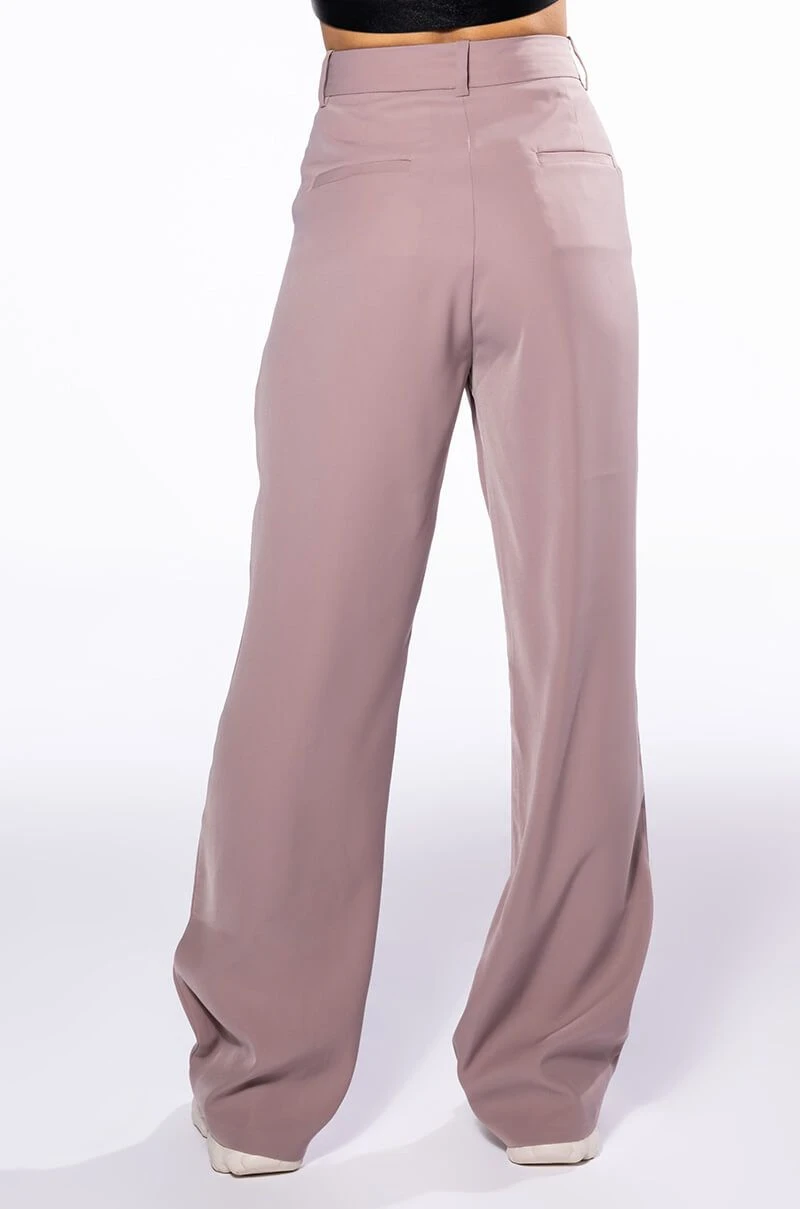 The AKIRA Label Logan Wide Leg Trouser In Taupe is made from a slick, lightweight fabrication and features a high rise waist, a wide waistband, working belt loops, slant side pockets, pleated stitching, jetted back pockets, and a wide leg silhouette. Complete with a double clasp and zipper front closure. Pair this suited-up piece with a mock neck top and pumps to complete your tailored look.