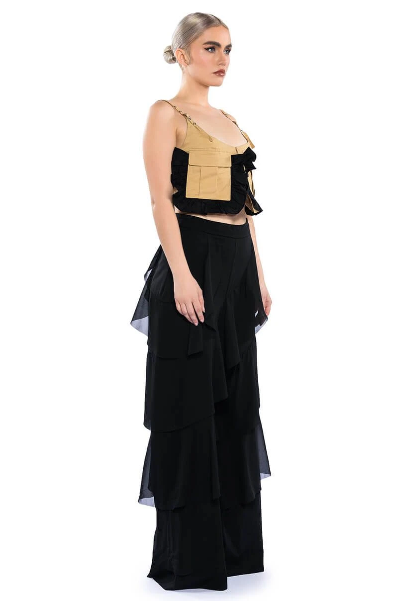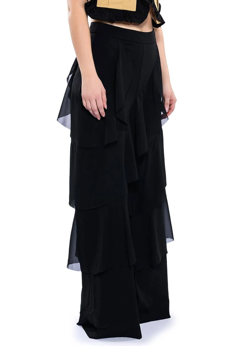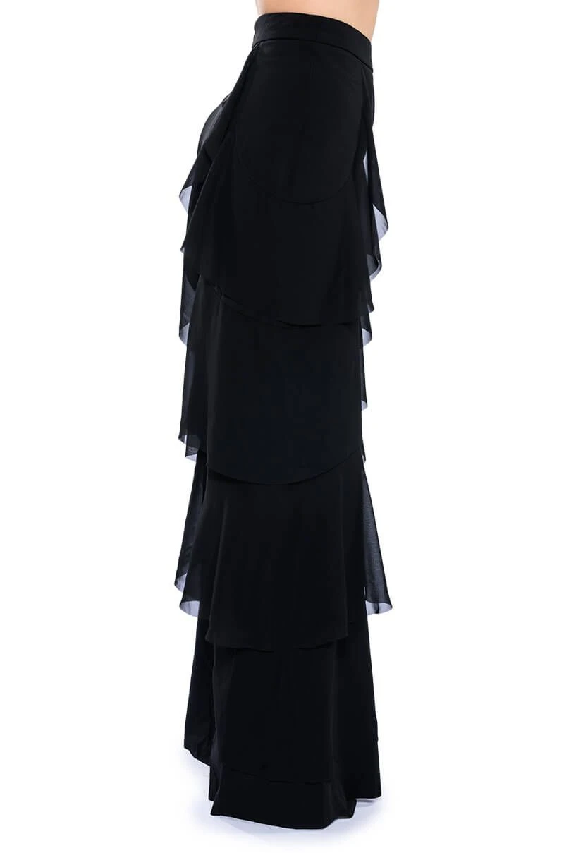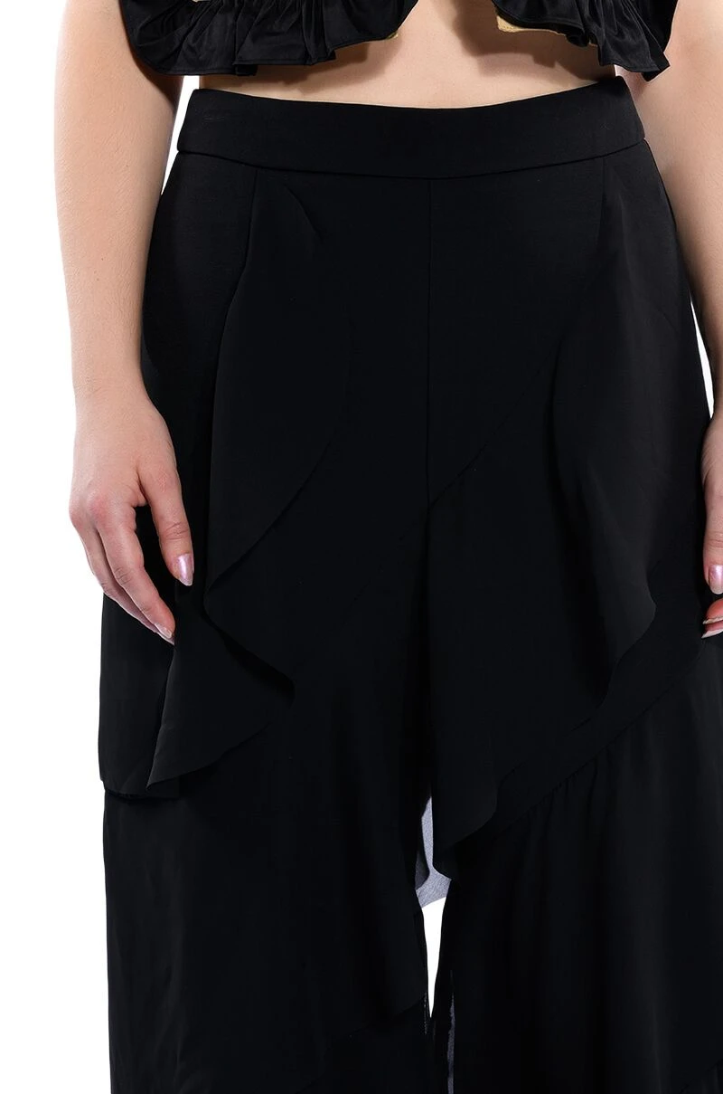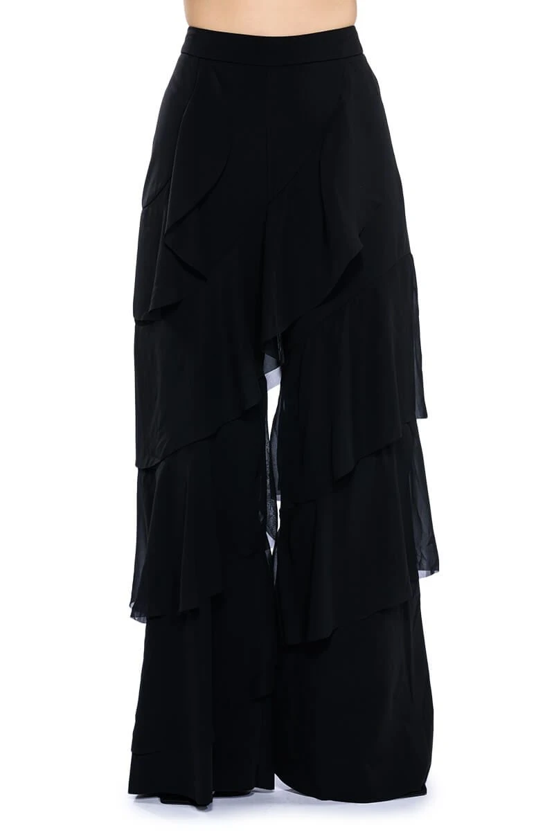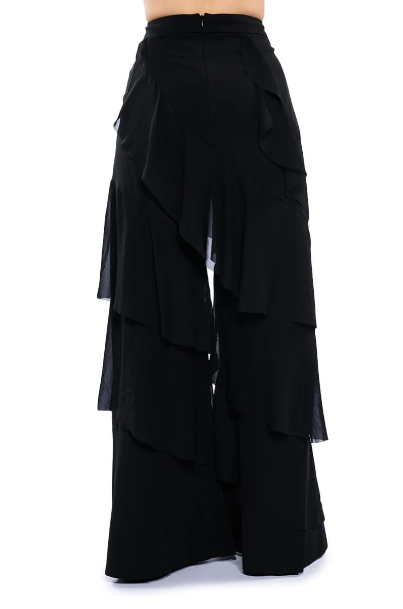 The AKIRA Label Loren Ruffle Detailed Pants are made from a slick trouser fabrication base and feature a high rise waist, a wide waistband, sheer, diagonal ruffle body detailing, a wide leg silhouette, and a tonal back zipper closure. Pair this piece with a fitted bodysuit and pumps to complete your flamenco-inspired look.
