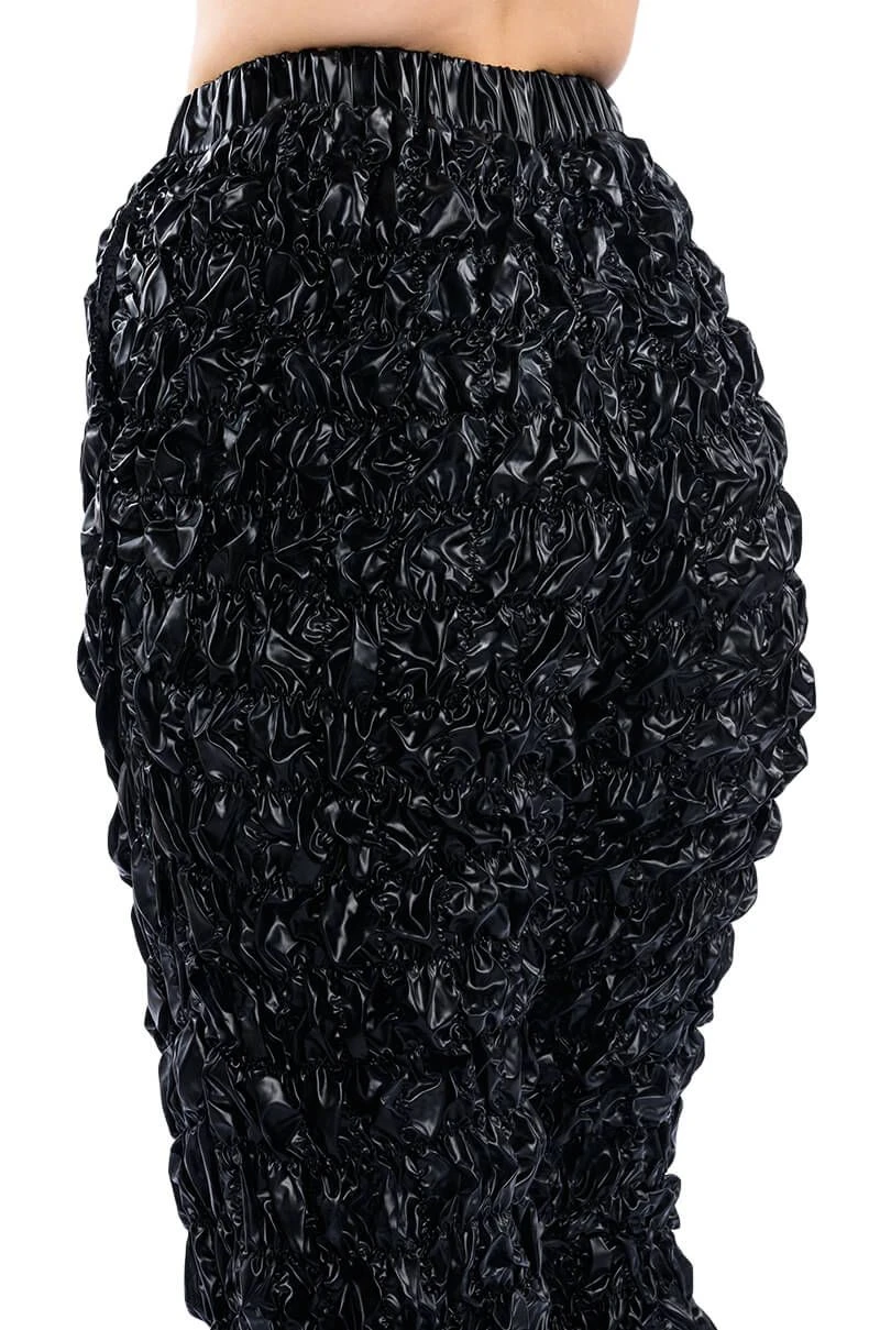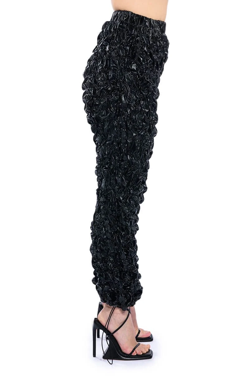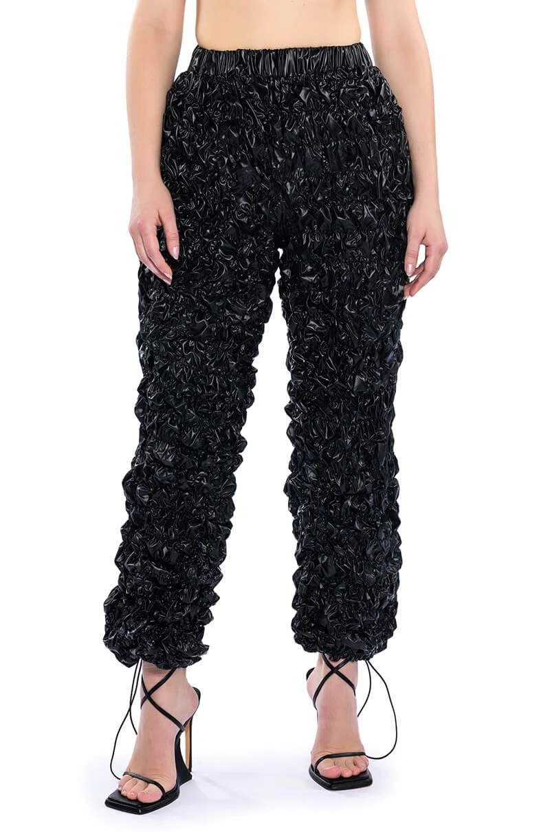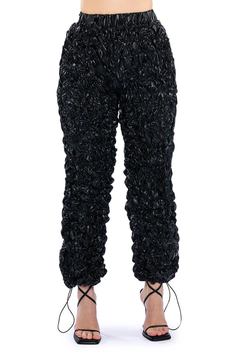 The AKIRA Label Lose Control Crinkled Faux Leather Pants are made from a crinkled faux leather fabrication and feature a high rise waist, a ruched elastic waistband, slant side pockets, a wide leg silhouette, and toggle drawstring ankle hems.