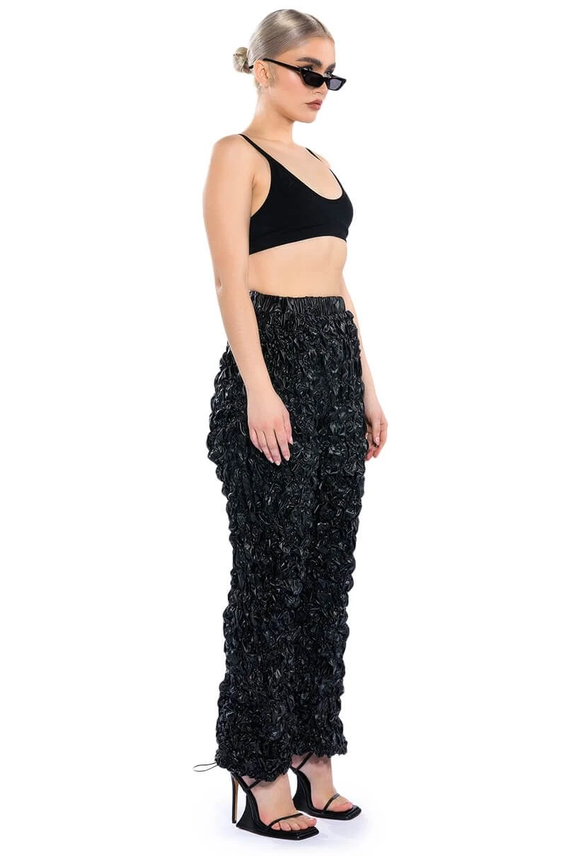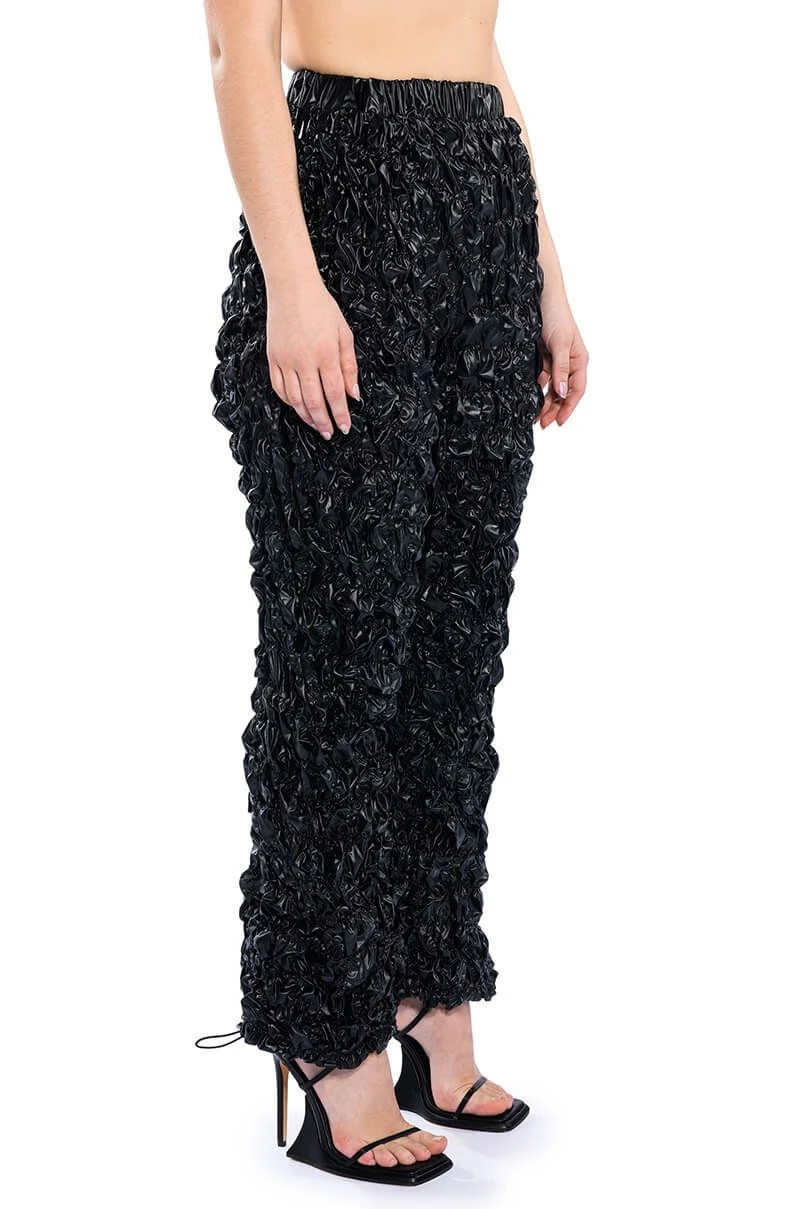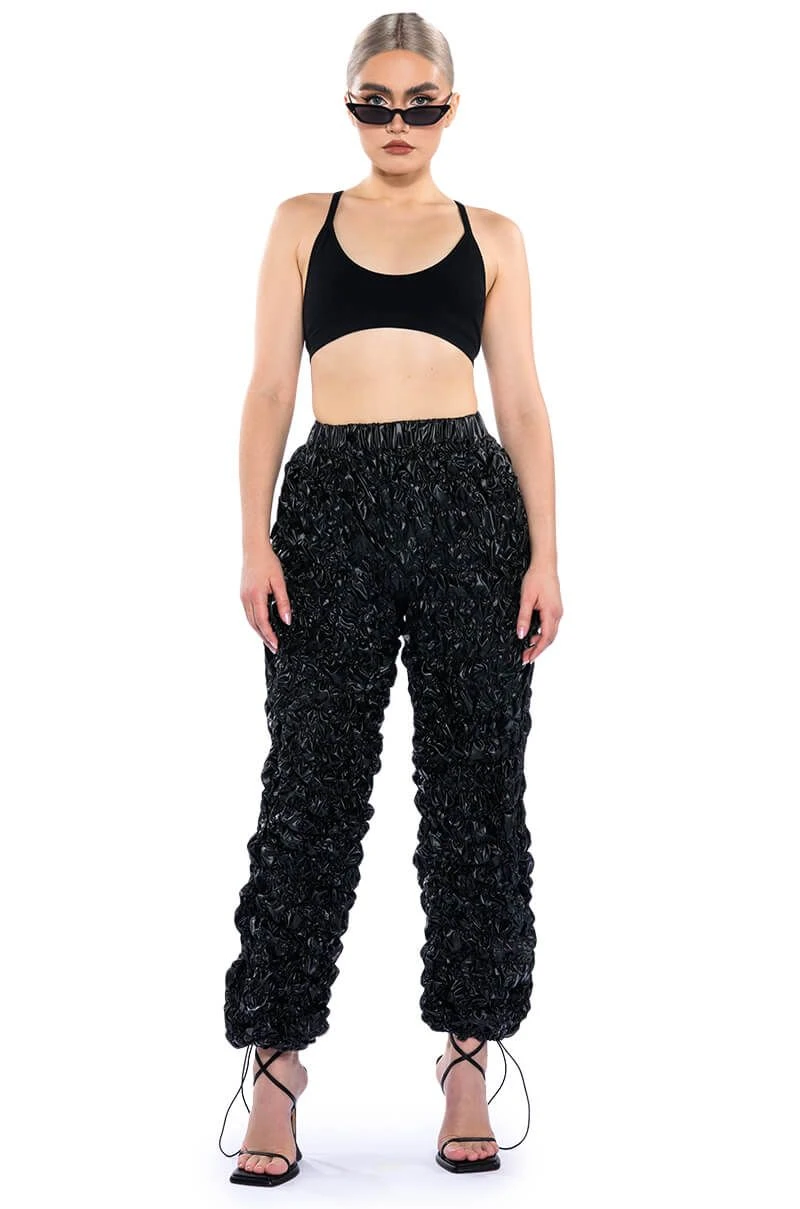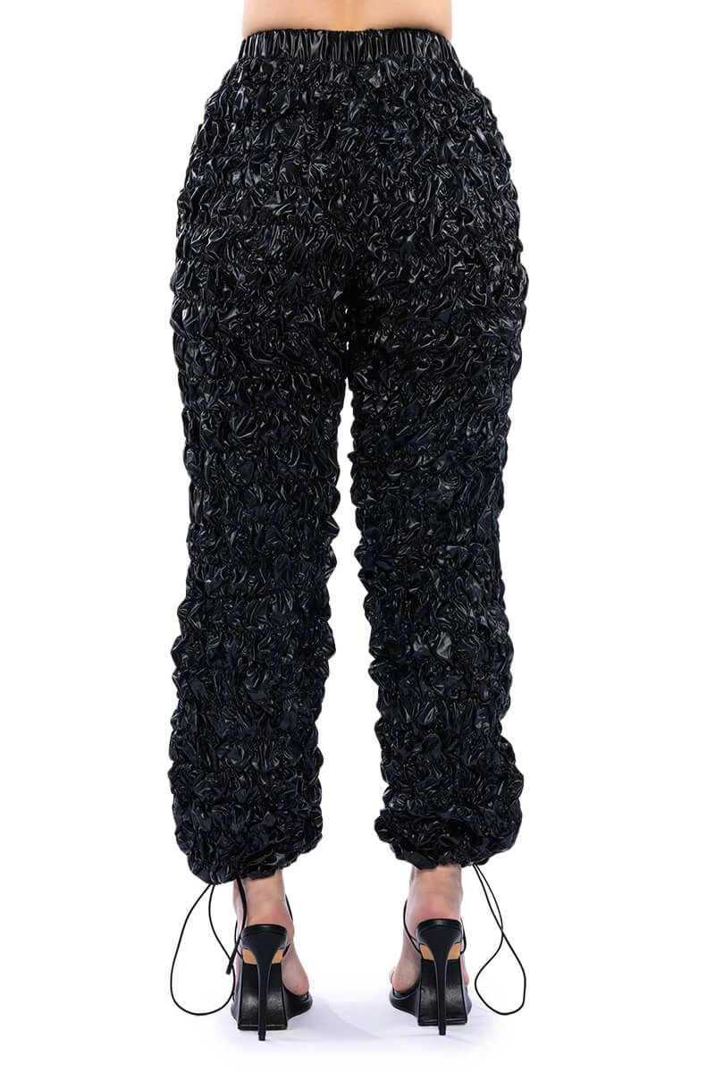 The AKIRA Label Lose Control Crinkled Faux Leather Pants are made from a crinkled faux leather fabrication and feature a high rise waist, a ruched elastic waistband, slant side pockets, a wide leg silhouette, and toggle drawstring ankle hems.