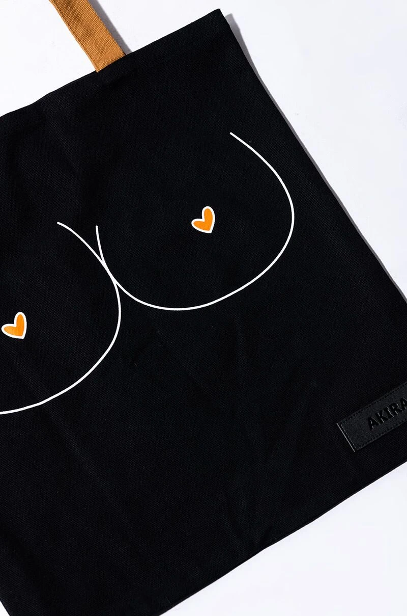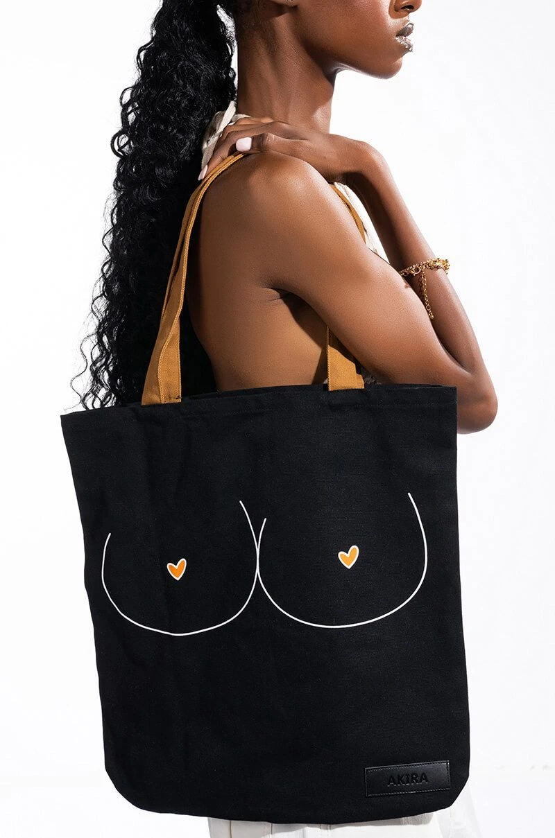 Spread the love with The AKIRA Label Love Is Love Canvas Tote! This top handle tote features a woven body, a printed underbust graphic with heart nipples, and a faux leather AKIRA label at the bottom. Perfect for pride, shopping, or on-the-go!