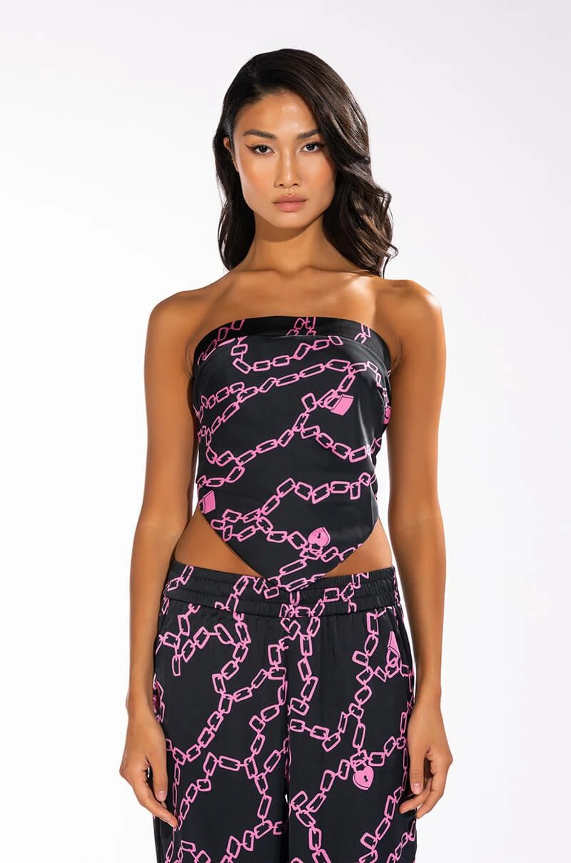The AKIRA Label Love Lock Tie Back Blouse is made from a slick satin fabrication and features a graphic heart lock and chains print, a straight across neckline, strapless silhouette, princess seam detailing, cropped length, a pointed hem, and a tie back closure. Pair this piece with the matching AKIRA Label Love Lock Wide Leg Palazzo Pants and strappy sandals to complete your bold look!