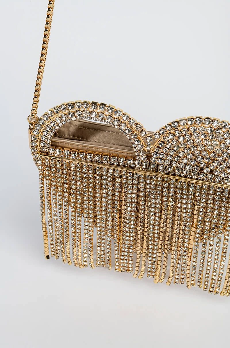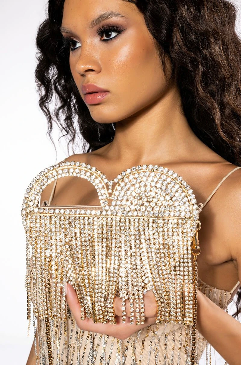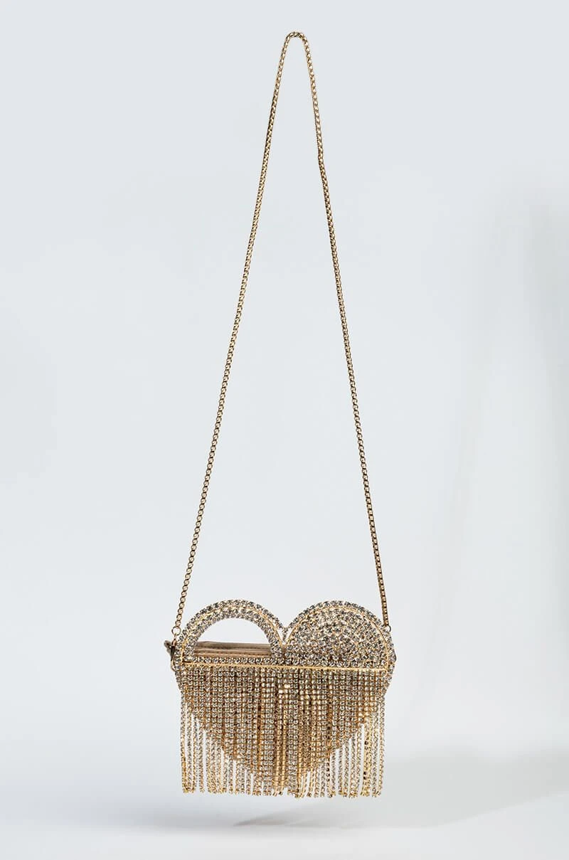 Wear your heart on your sleeve with The AKIRA Label Lover Lover Gold Drippy Heart Bag! This handbag has a faux gold metallic heart frame body with ornate lattice detailing. Complete with allover rhinestone embellishments, rhinestone fringe, a removable zippered pouch, and a detachable chain strap. Wear this with any of your favorite evening dresses for a blinged-out date night look!