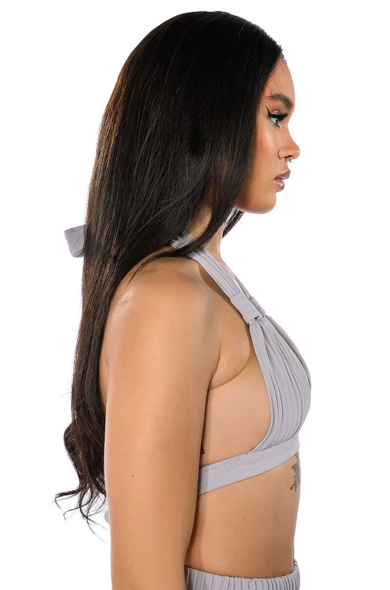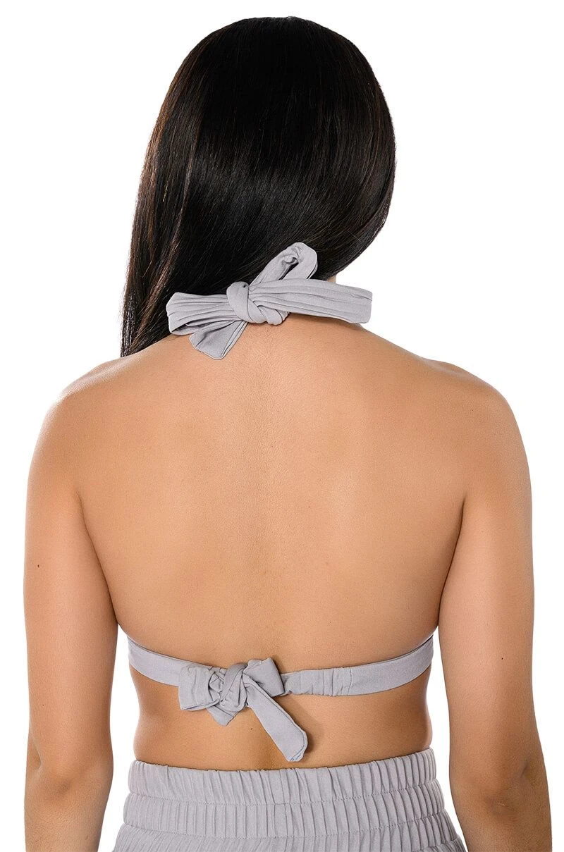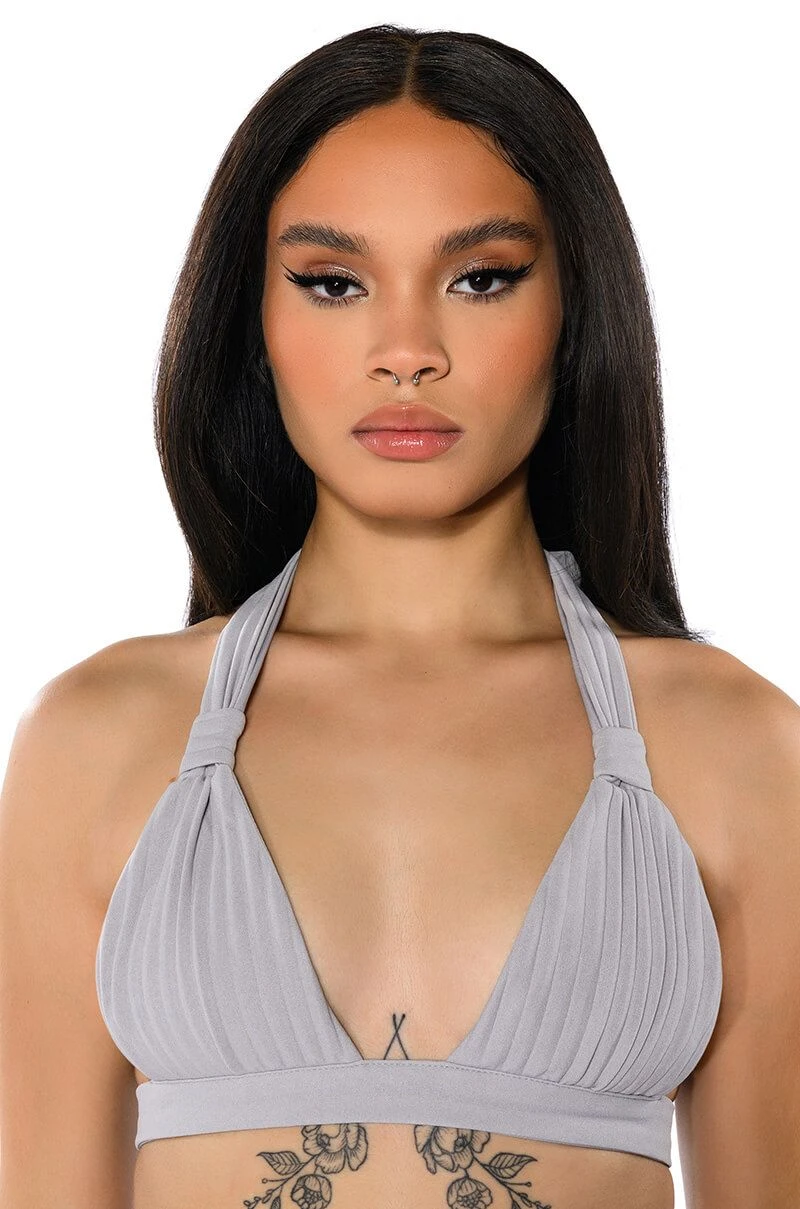 The AKIRA Label Lucy Bralette is a part of an elegant 3-piece set, and is made from a pleated polyester fabrication. Complete with a halter neck tie silhouette, triangle pleated cups, and a sleek, wrap around tie-back band. Pair with the coordinating AKIRA Label Lucy High Rise Wide Leg Pant, Lucy Short Sleeve Button Down, and booties for a finished chic, executive look.