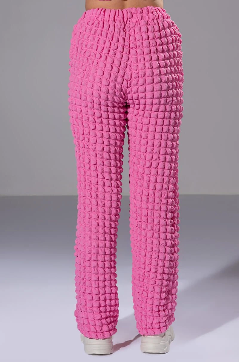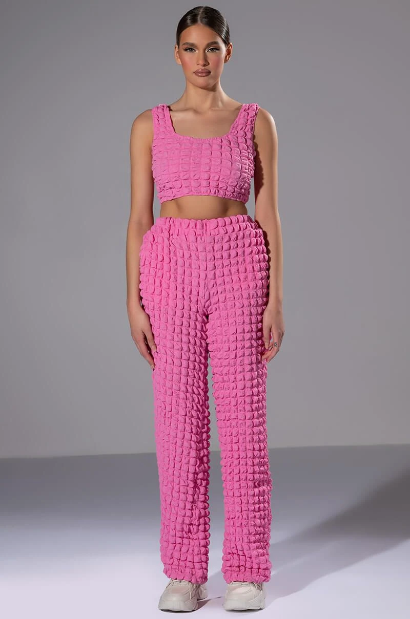 The AKIRA Label Lucy Textured Wide Leg Pant is made from a stretchy popcorn fabrication and features a high rise waist, a wide elastic waistband, slant side pockets, a wide leg silhouette, and a pull-on fit. Pair this piece with the matching AKIRA Label Lucy Textured Button Down Blouse and Lucy Textured Crop Tank Top to complete your look.