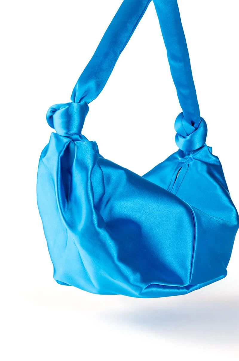 The AKIRA Label Magnolia Satin Blue Purse is made from a slick satin fabrication and features a knotted shoulder strap, a slouched half moon silhouette, stitched detailing, and a top zipper closure. Perfect for adding vibrant color to any ensemble! Pair with the coordinating Azalea Wang Star Stretch Thigh High Stiletto Boot In Turquoise for a complete look.