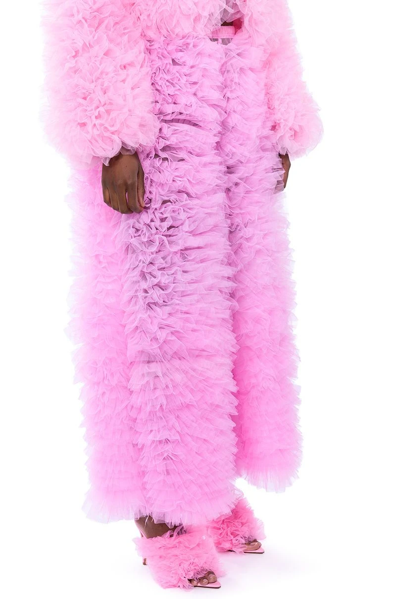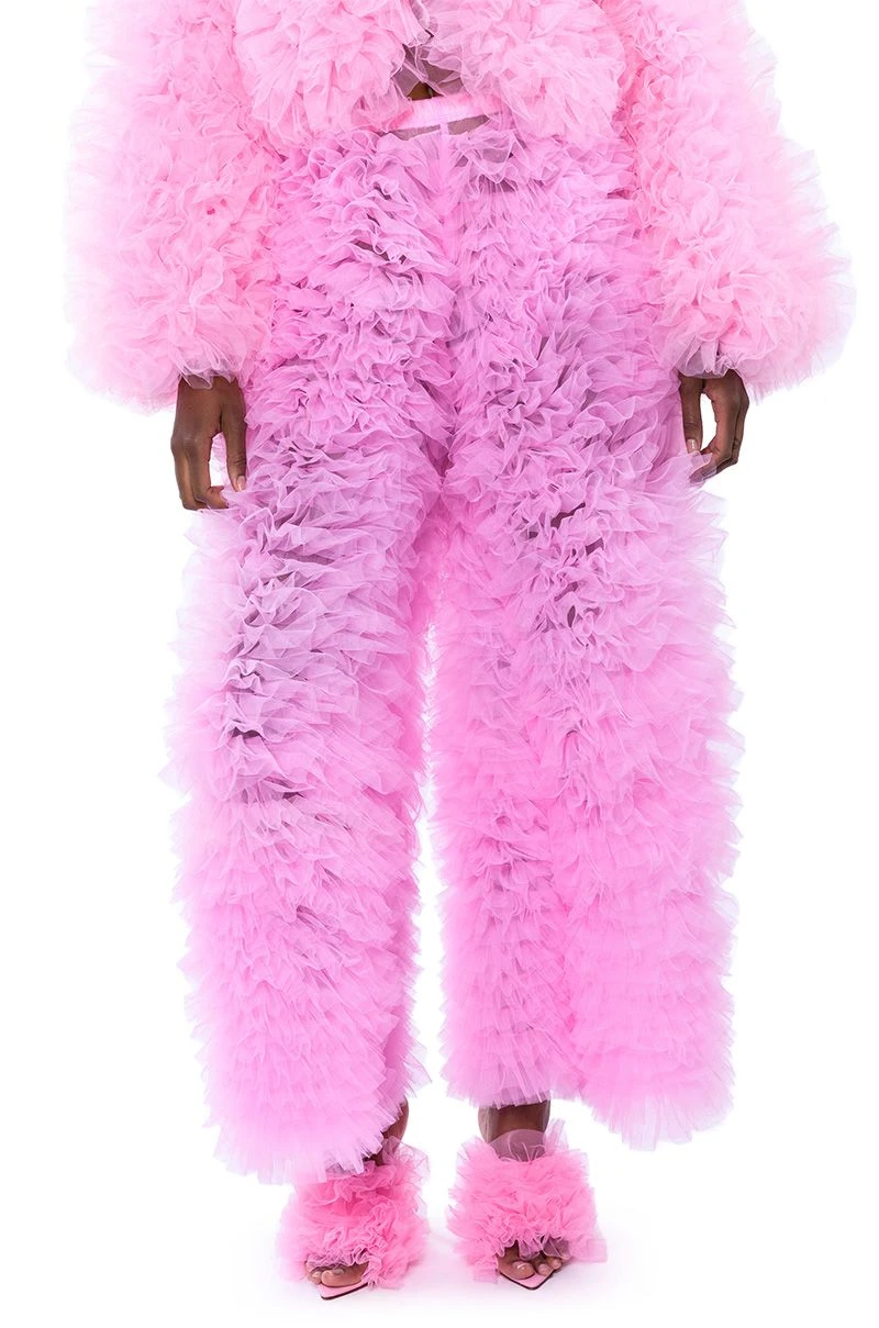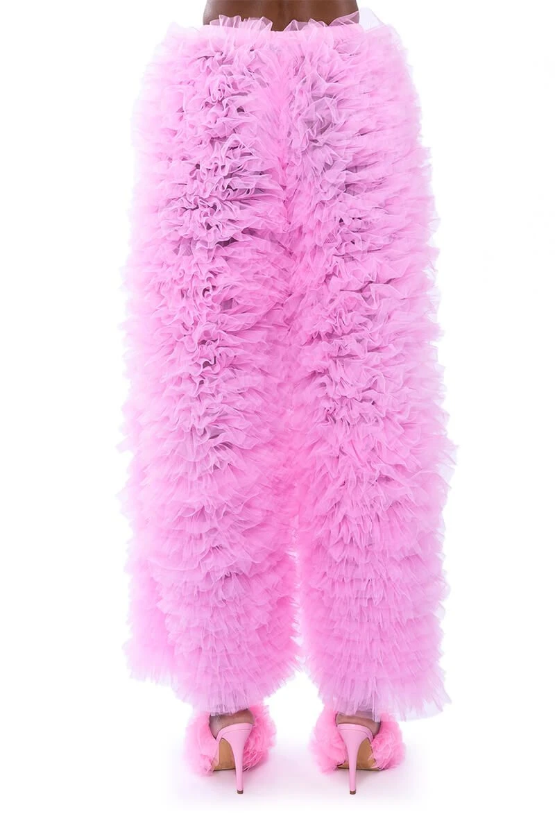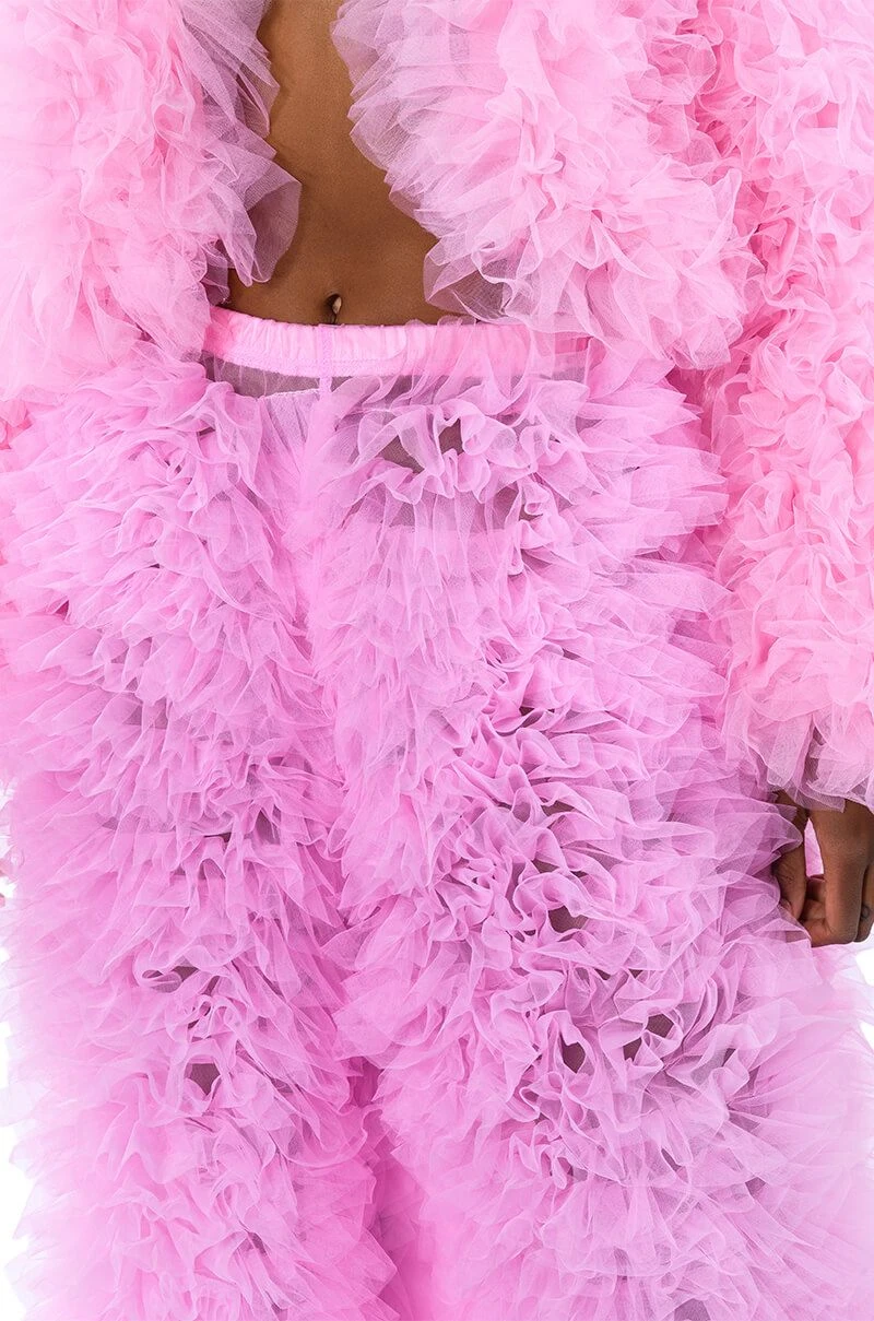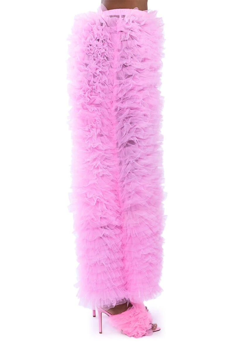 The AKIRA Label Main Character Tulle Pant is made from a sheer fabrication and features a high rise waist, a wide ruched elastic waistband, layered ruffle tulle detailing, and a wide leg silhouette. Pair this dramatic piece with a mock neck bodysuit and stilettos to complete your look.