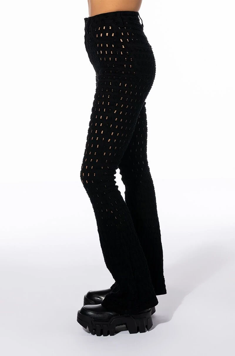 Gotta craving for sexy denim? Time to snag The AKIRA Label Make You Want More Distressed Flare Jeans. These stretchy flare pants feature a high waist rise, a zipper fly button fasten, a curve hugging fit, working back pockets, wide flare hems, and all-over distressed hole detailing. Pair with your favorite sleek turtleneck and patent ankle booties to complete the look.
