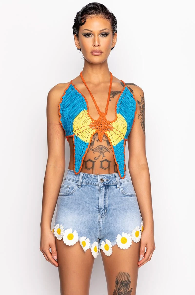 Soar in style with The AKIRA Label Mariposa Crochet Halter Top! This patterned piece is made from an unlined crocheted base and features a halter tie neckline, a multicolor butterfly design, cropped length, and a sexy open back with self ties. Pair this piece with high waisted bottoms and strappy sandals for a flirty, colorful look!