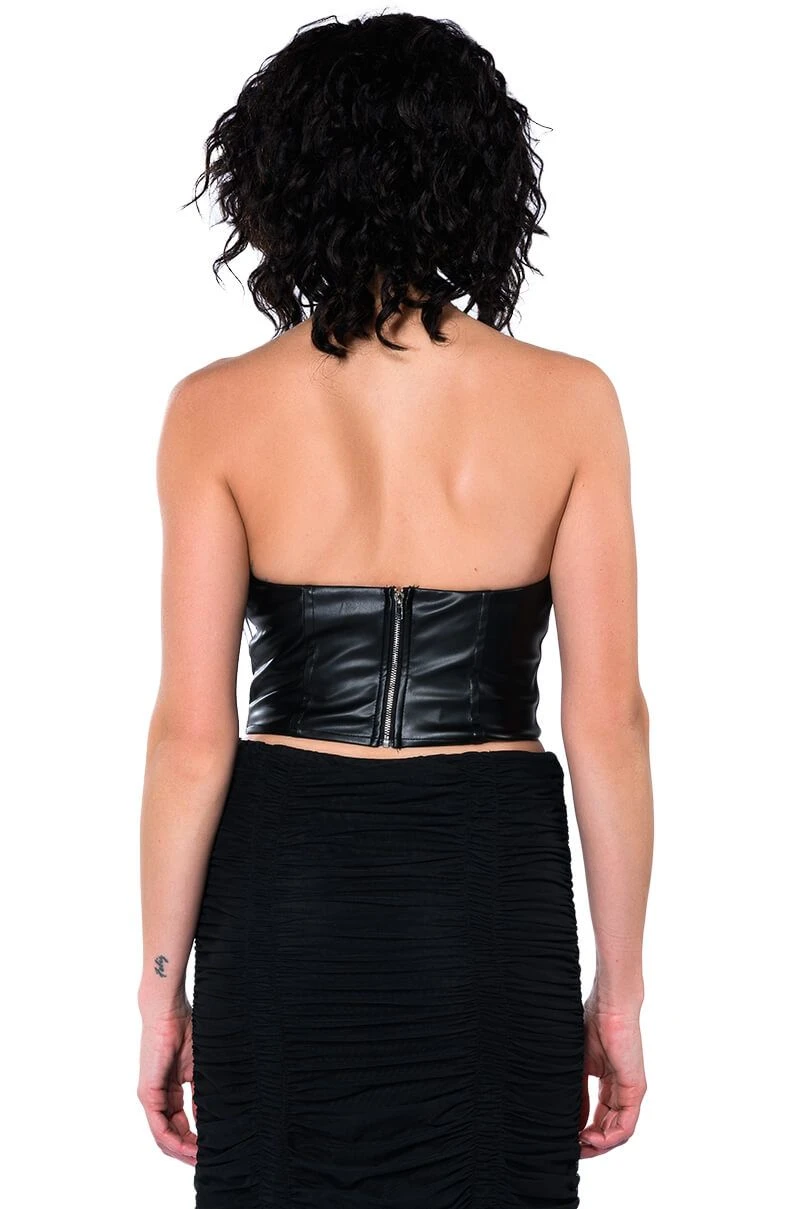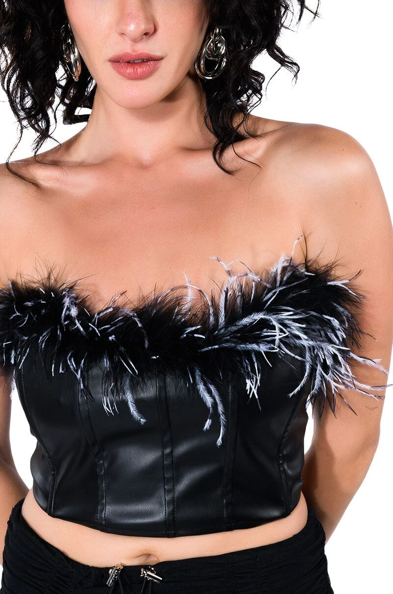 Seize the moment with The AKIRA Label Melinda Feather Detail Top! This sexy yet cute top features a sleek, vegan leather base fabrication, opulent feather trim, and boning for structure. The strapless and bodycon silhouette has an exposed zipper back closure. Pair with a mini skirt and knee-high boots or with relaxed cargos and chunky heels to complete your glam look!