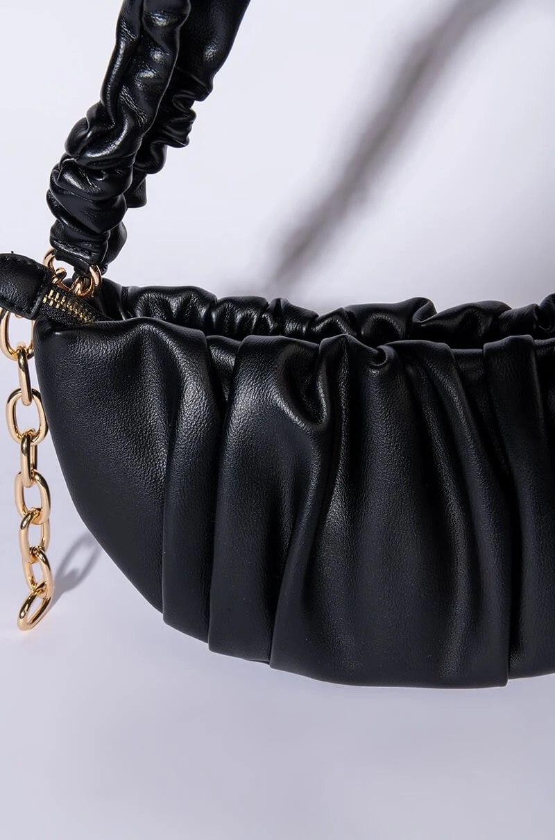 The AKIRA Label Melrose Scrunchie Bag is made from a vegan leather fabrication and features a scrunched shoulder strap, a top zipper closure, and a pleated half moon silhouette. Complete with an additional, detachable scrunched shoulder strap and chain detail.