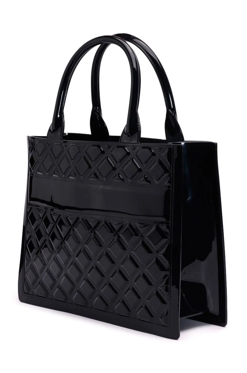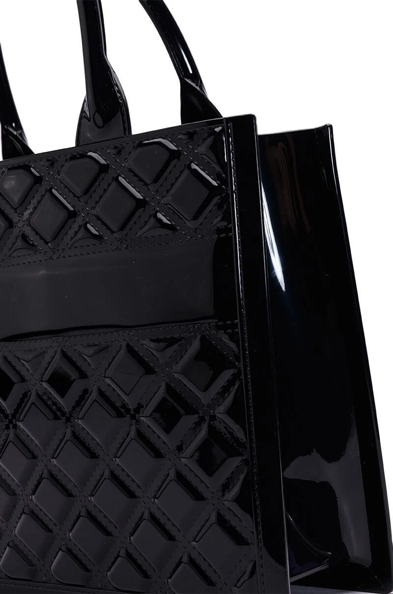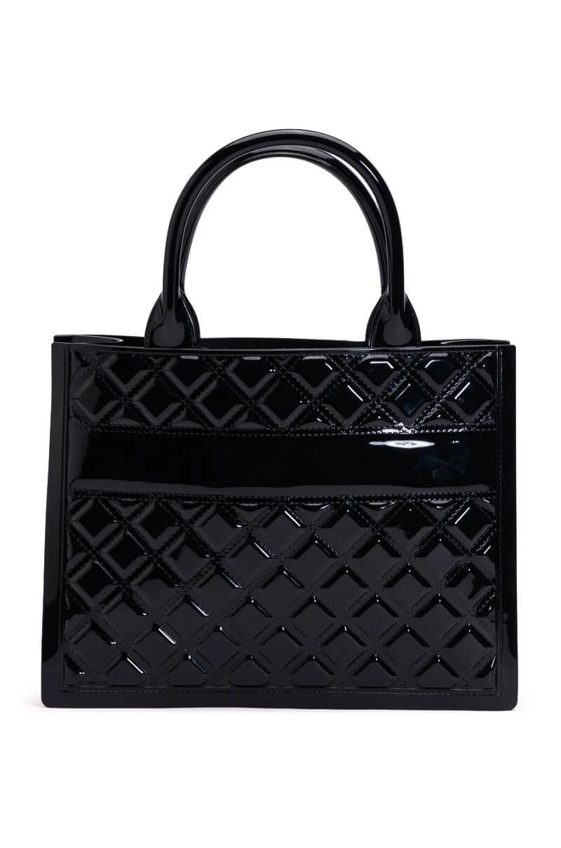 The AKIRA Label Mine Or Yours Quilted Tote Bag is made from a glossy rubber fabrication and features quilted diamond patterning, a boxy silhouette, dual top handles, an open top, and a roomy interior.