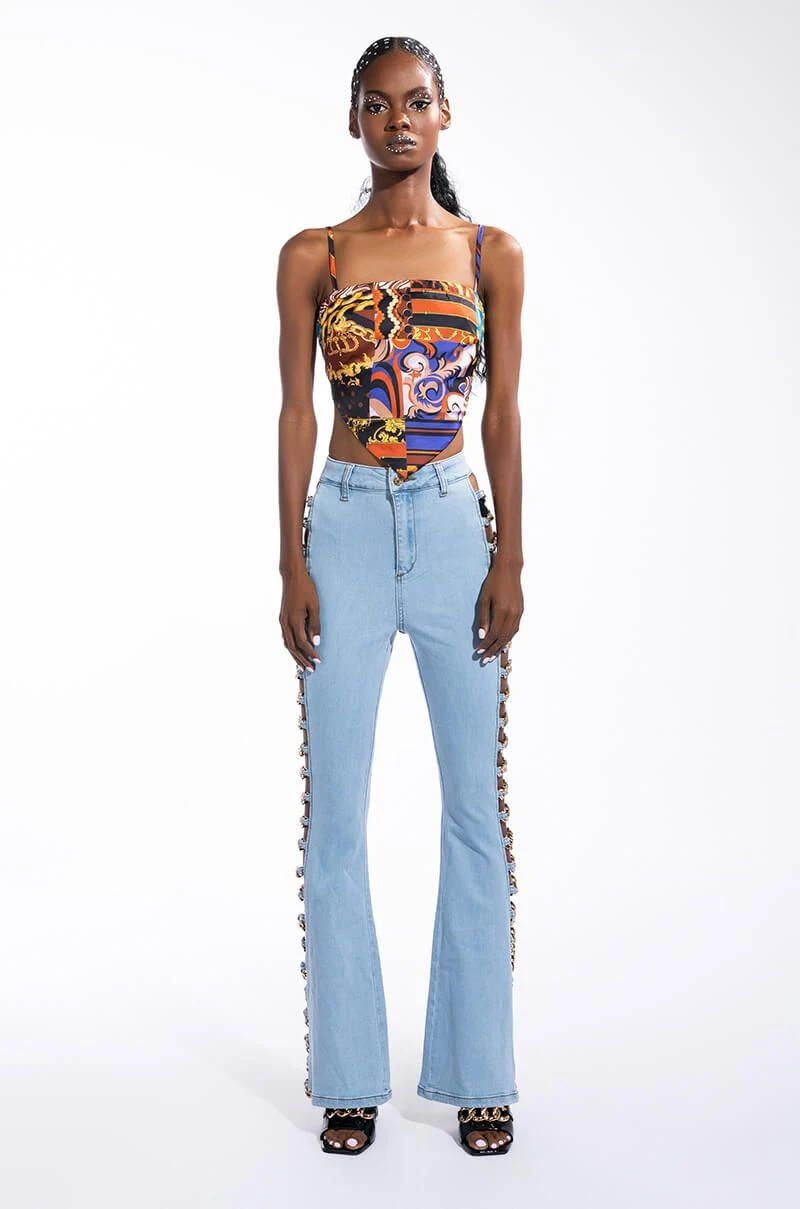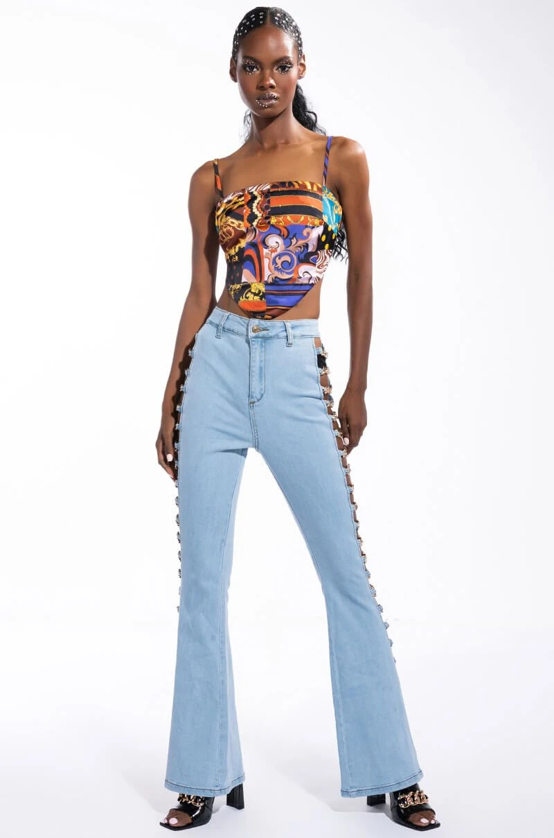 Step to the beat of your own vibrations with The AKIRA Label New Sensation Chain Detail High Waisted Flare Jeans. These stretch denim pants feature cut out side detailing, chunky chain link accents, a high rise waist, and a retro flare leg silhouette. Complete with working belt loops, back pockets, and a button up and zipper closure. Pair with a cute cropped halter, and slay the day away.