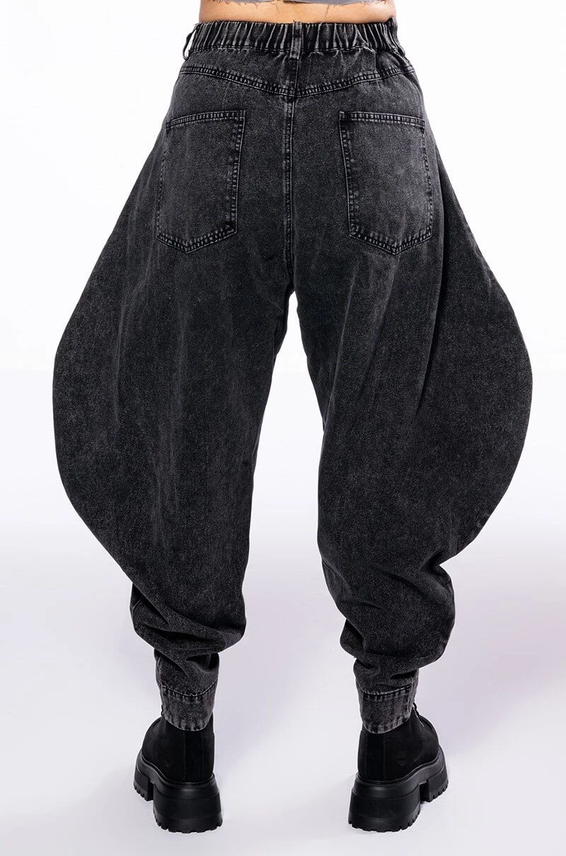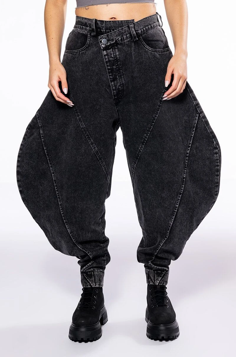 The AKIRA Label New You Abstract Volume Denim Pant is a unique jean bottom featuring an asymmetrical high rise waist, a wide elastic back waistband, and an ultra voluminous silhouette that tapers to skinny ankle hems. Complete with front and back pockets, diagonal seam detailing, functional belt loops, and a multi-button front closure.