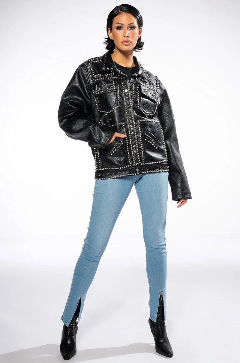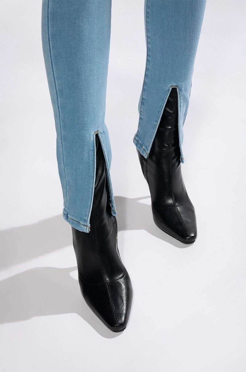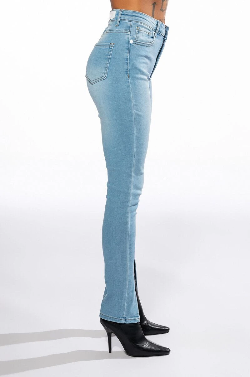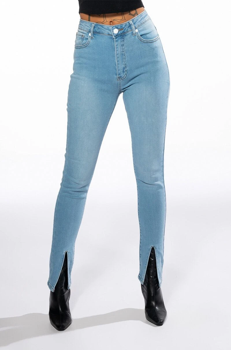 The AKIRA Label Nightfall Mid Rise Skinny Jeans With Front Slit are an updated take on the classic pair of denim bottoms. These mid rise curve hugging pants feature an ankle length silhouette, a high pocket design, working belt loops, and center front hem slit detailing. Style with a snug graphic tee for a casual look or try a peplum blouse for an elevated take.