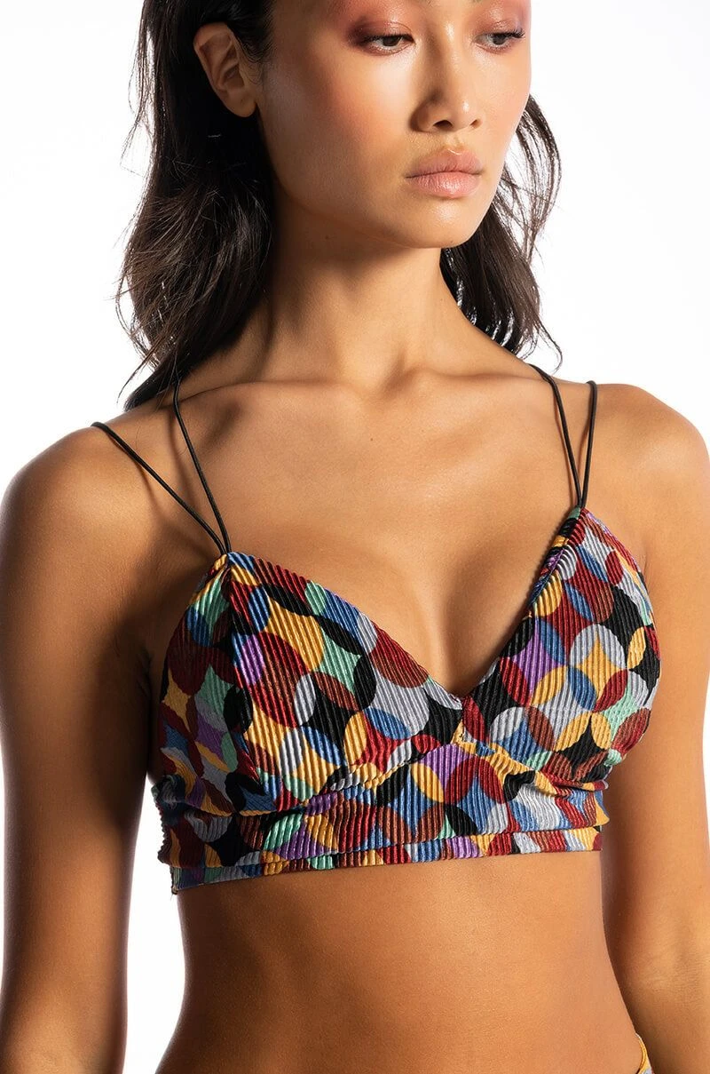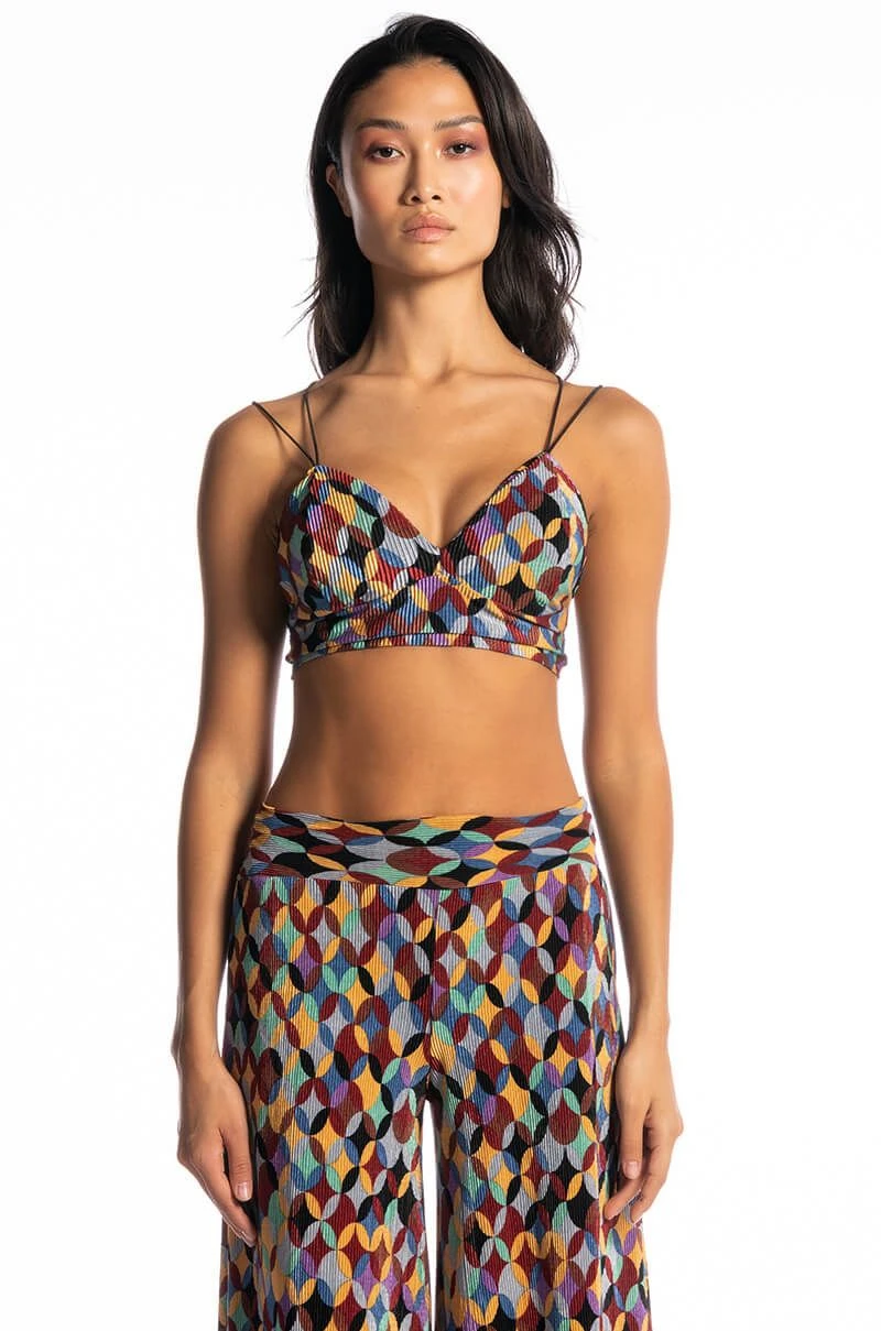 The AKIRA Label No Promises Bralette Top is made from a slick, pleated fabrication and features a groovy, multicolor print, thin elastic T-back straps, a plunging neckline, padded cups, and a cropped silhouette. Pair this piece with the matching AKIRA Label No Promises Palazzo Pants and stiletto booties to finish off your 70’s-inspired look.