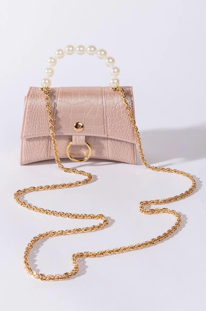 The AKIRA Label Not A While Crocodile Beige Mini Bag features a structured rubber fabrication base, embossed croc patterning, a pearl detail top handle strap, and a chain link shoulder strap. Complete with a front flap, magnetic snap button closure, gold ring front detail, and an inner pocket.