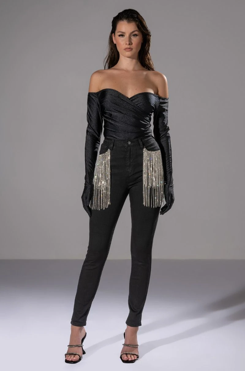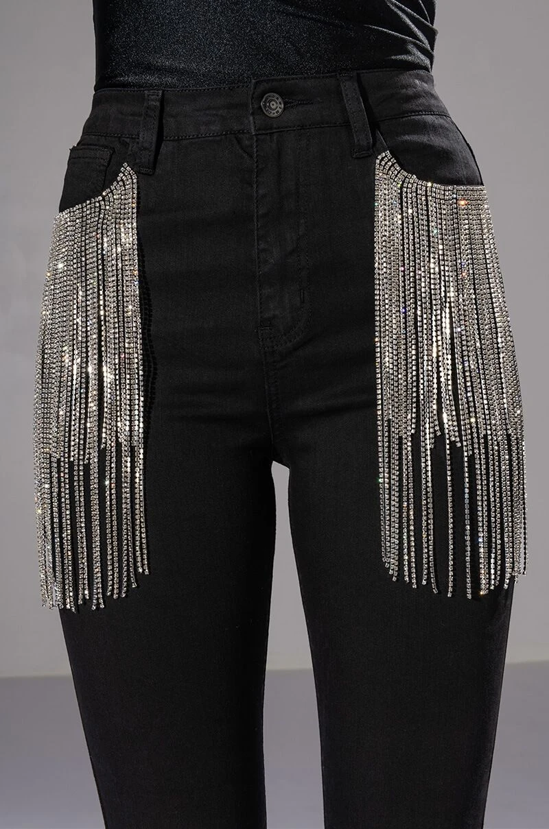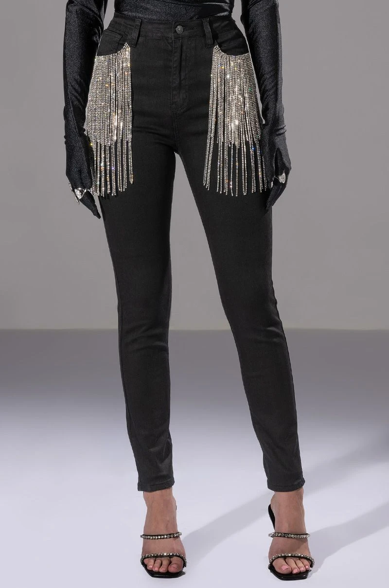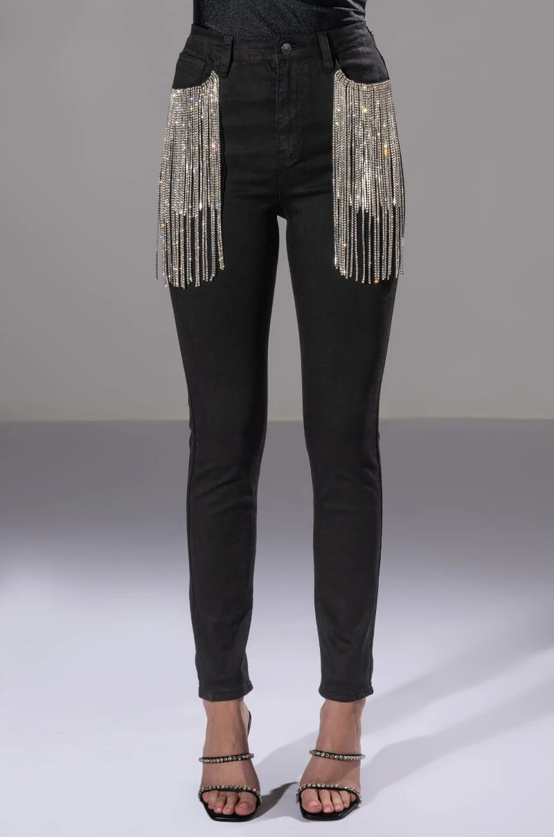 It doesn’t get better than The AKIRA Label Nothin Better Rhinestone Pocket Skinny Jeans. These bodycon jeans feature rhinestone fringe front pockets, working back pockets, a high rise waist, and a classic zipper and button up enclosure. Style these with some western booties and a cropped moto jacket.