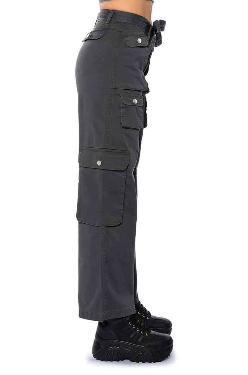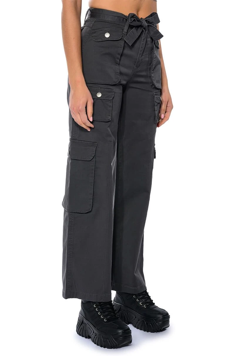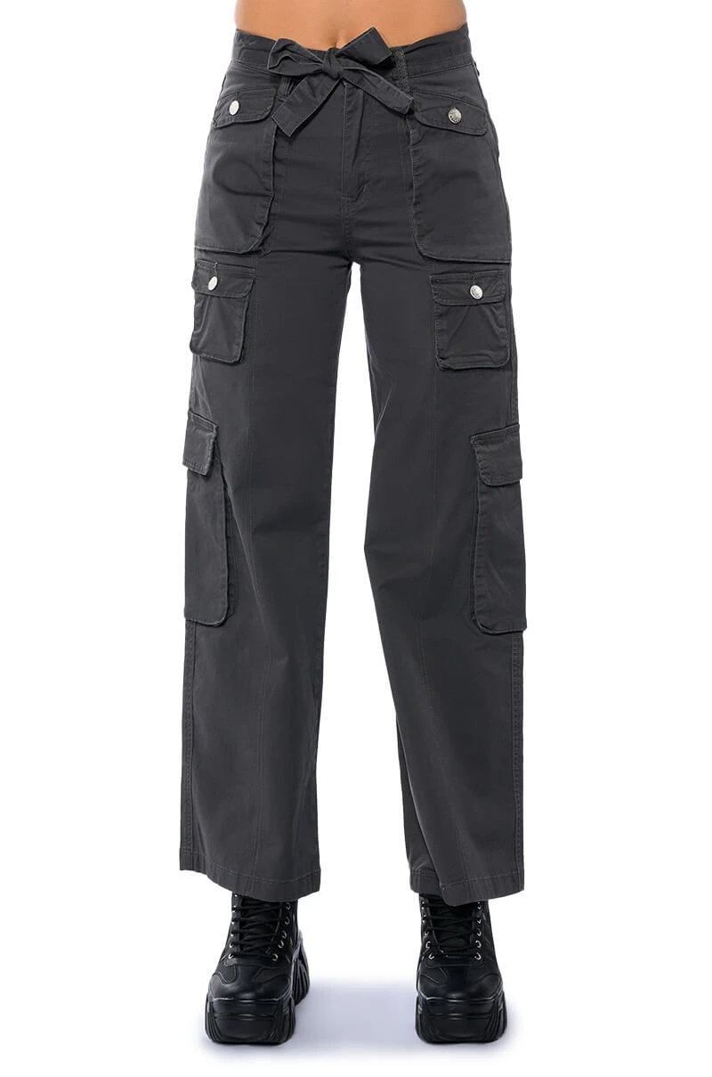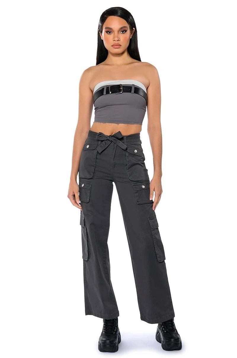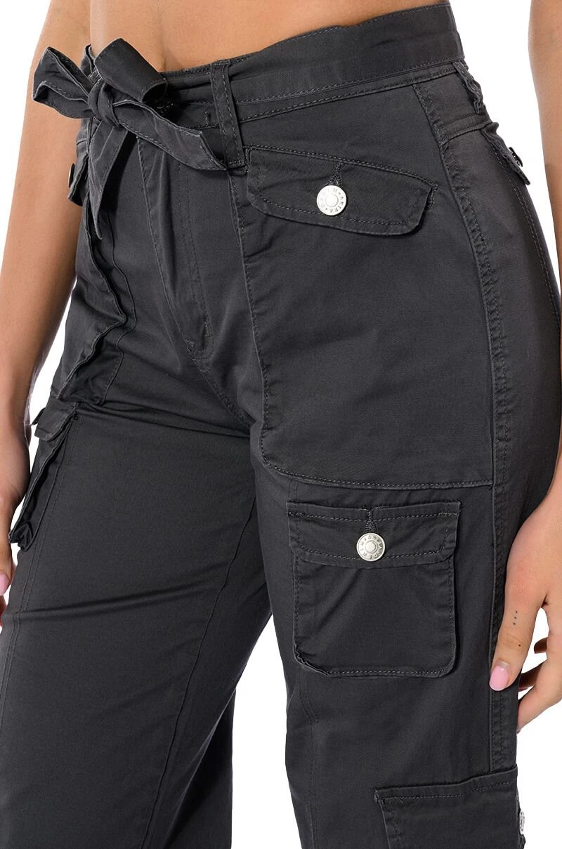 Delete their number in The AKIRA Label Nothing About You Belted Cargo Pants! These cargo pants are made from a smooth, structured fabrication and feature working belt loops with a front-tie belt, a high waisted silhouette, buttoned cargo flap pockets, and utility seaming. Complete with a wide leg, classic zip to button front closure, and working back pockets. Style with a sleek bodysuit and platform boots for the ultimate hot girl look.