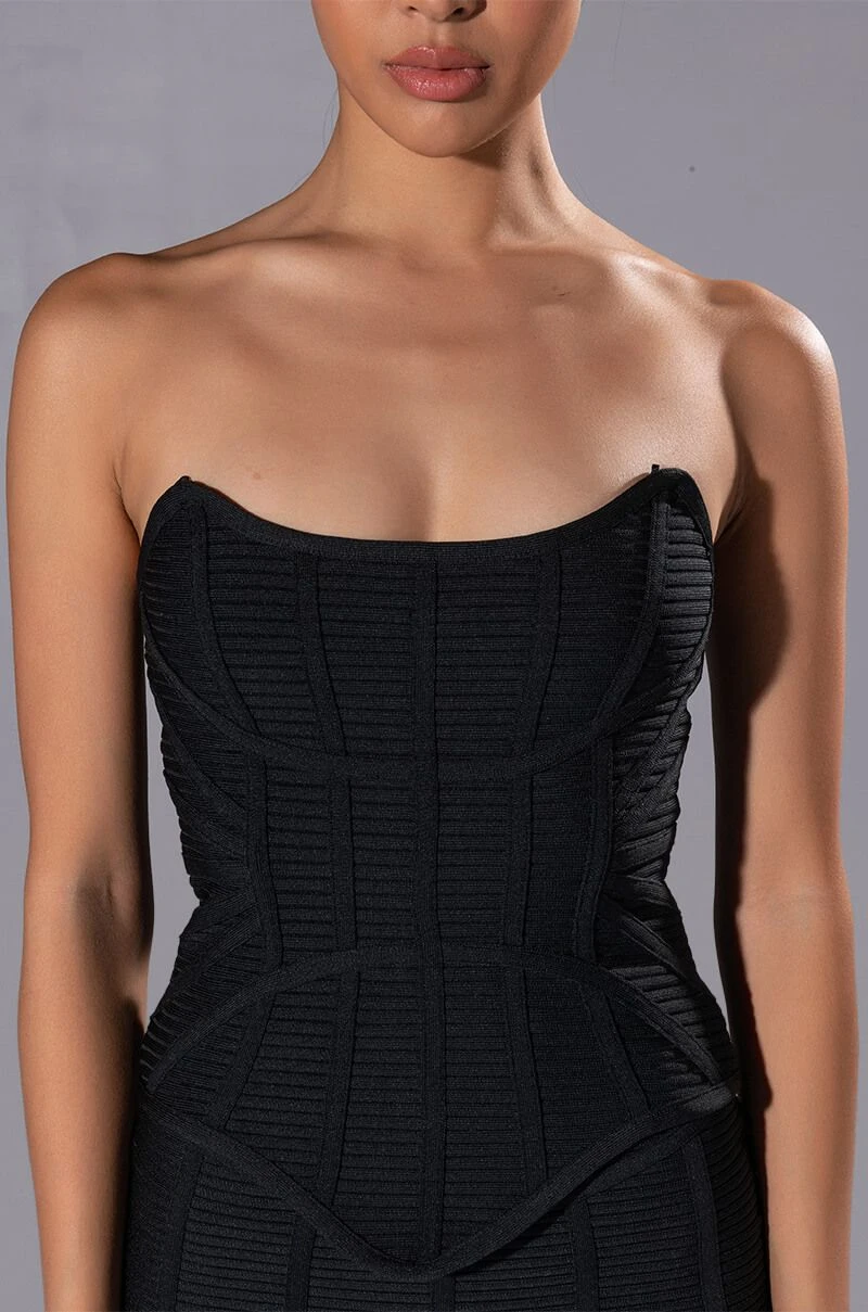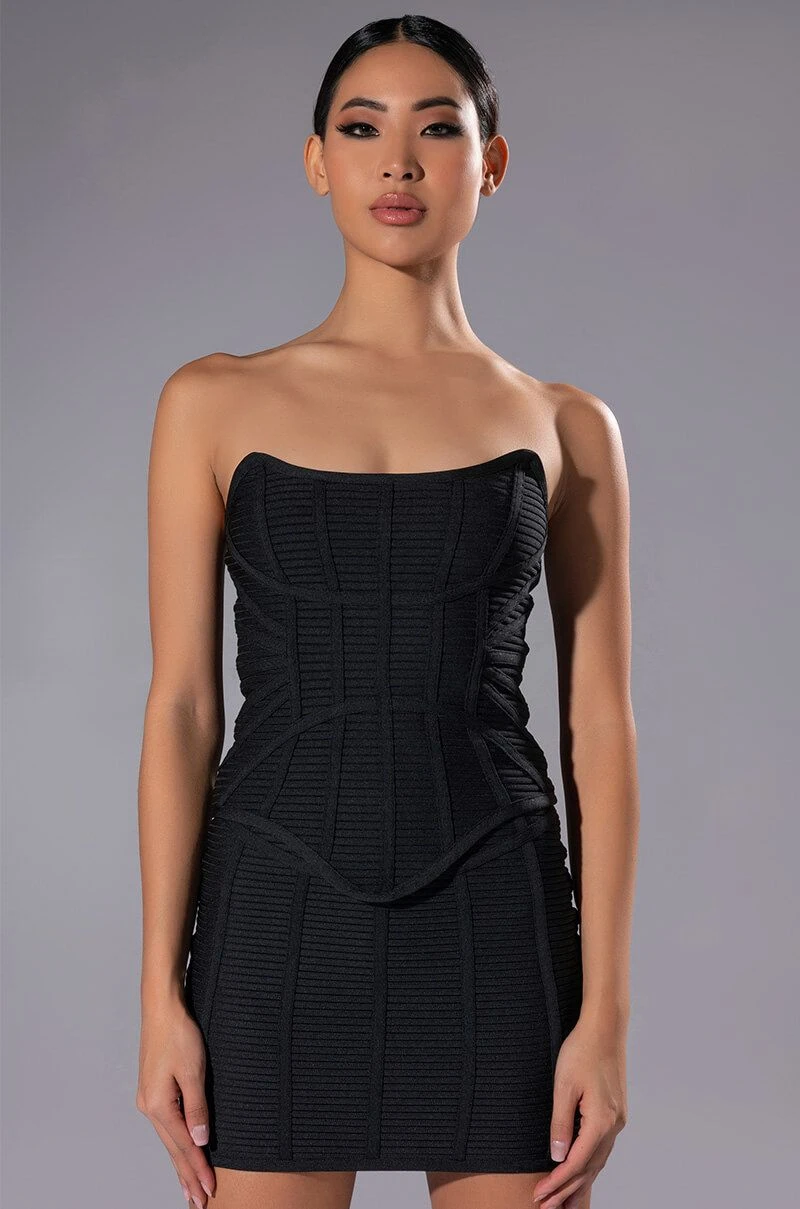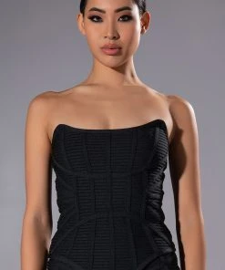 The AKIRA Label Ocean Eyes Strapless Bandage Corset features a stretch knit bandage fabrication, a curved strapless neckline, a point hem, contrast seam detailing, and a faux gold back zipper closure. Complete your look with the matching AKIRA Label Ocean Eyes Bandage Mini Skirt.