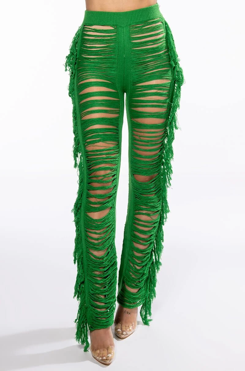 The AKIRA Label On The Border Knit Bralette And Pants Set is made from an unlined knit base and features a bralette and pants. The bralette features a tie halter, a triangular bralette silhouette, fringe hems, and a tie back closure. The pants feature a high rise waist, a covered elastic waistband, skinny fit shredded legs with fringe trim, and a pull-on silhouette. Pair this set with the coordinating AKIRA Label On The Border Knit Top to complete your look.