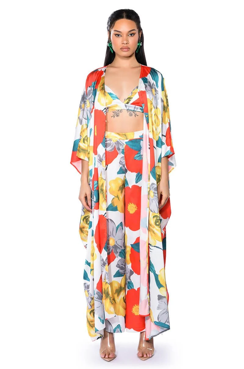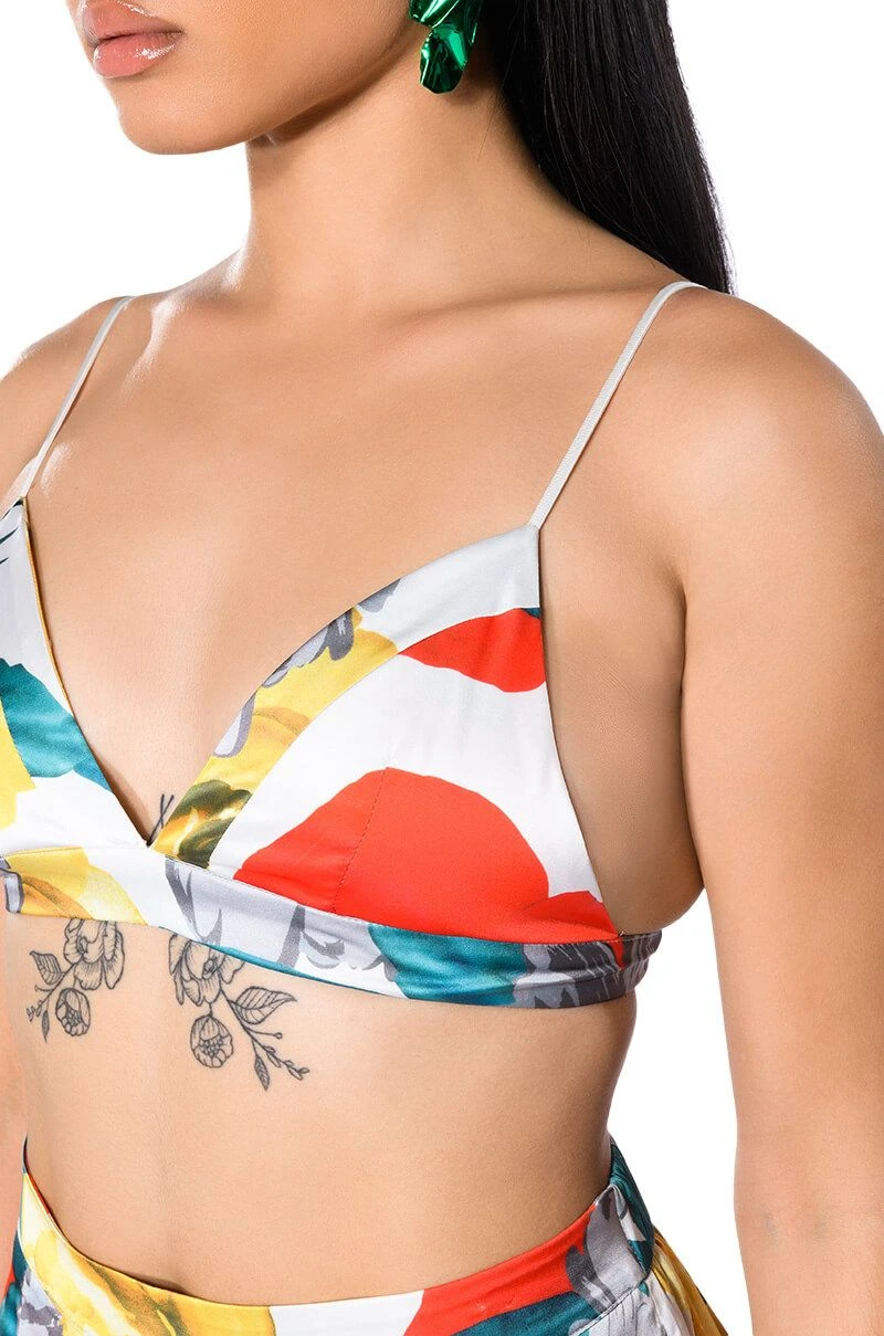 The AKIRA Label On The Patio Triangle Bralette is made from a slick satin fabrication and features a vintage-inspired floral print, ultra thin elastic tank straps, a triangular bralette silhouette, a cropped length, and button back closures. Pair this piece with the matching AKIRA Label On The Patio Palazzo Pants and On The Patio Kaftan to complete your chic lounge-ready look.