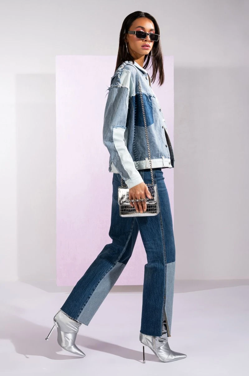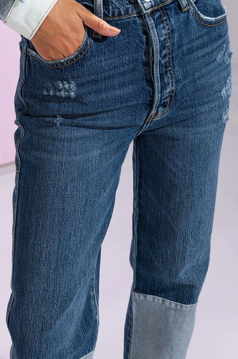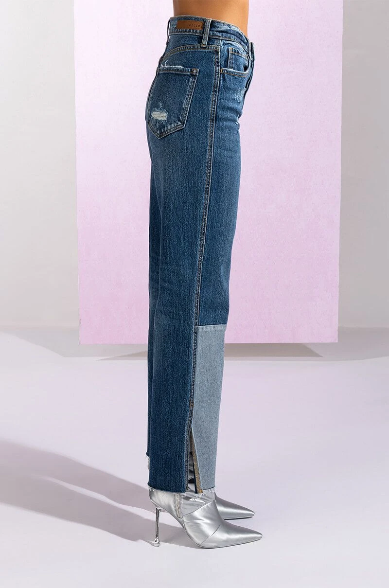 The On The Road Again High Rise Straight Leg Patchwork Jeans are made from a washed denim fabrication and feature a high rise waist, working belt loops, a classic five-pocket design, whiskered detailing, light distressing on the thighs and back pockets, straight pant legs, patchwork calf panels, side ankle slits, raw hems, and a front button and zipper closure.