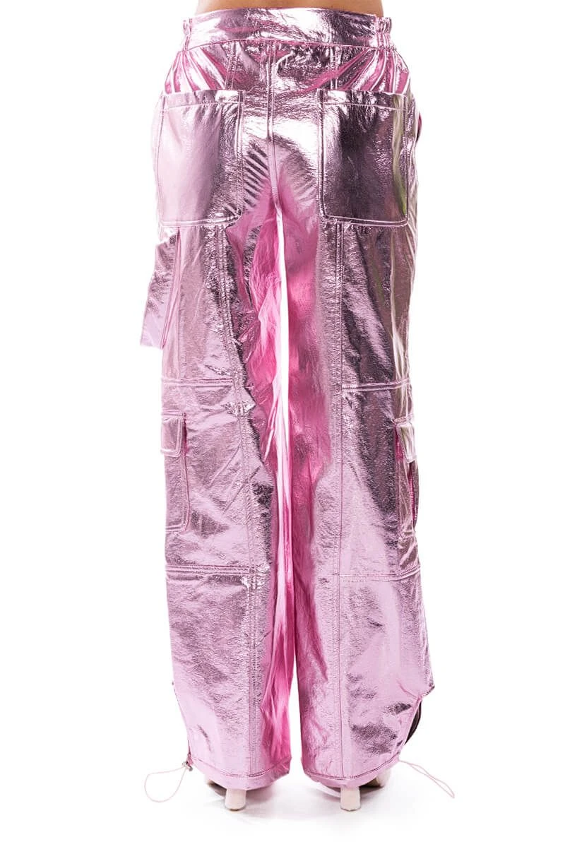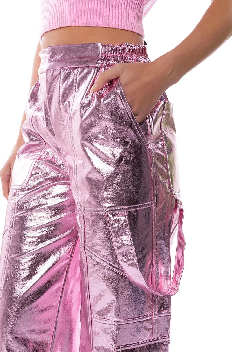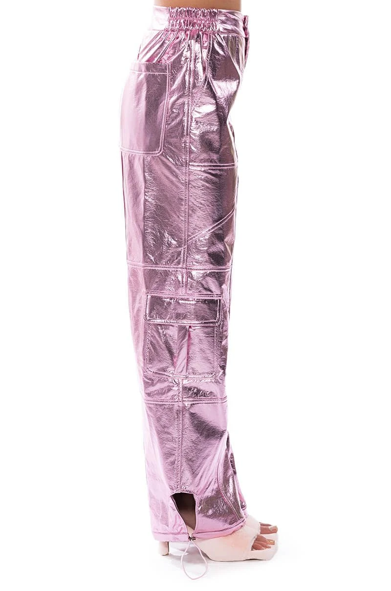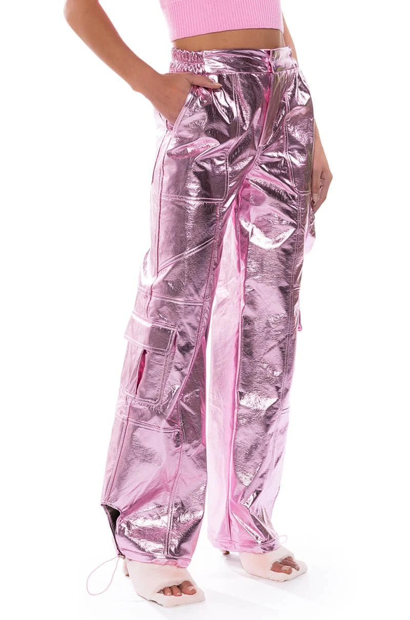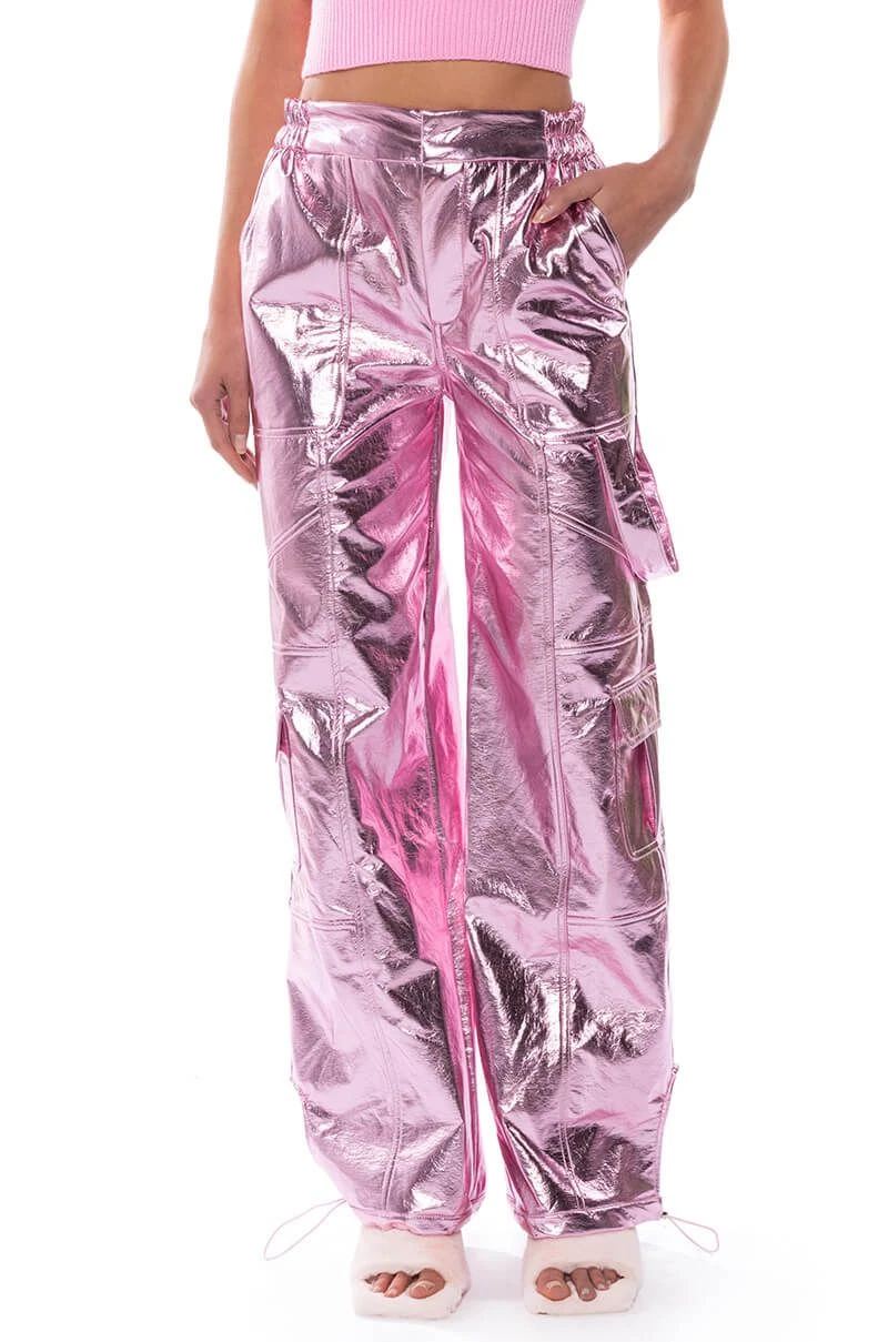 Star girl vibes. The AKIRA Label Out Of This World Metallic Cargo Pant is a textured metallic faux leather bottom featuring a high waist rise, a zipper fly hook and eye fasten, cargo flap side pockets, working back pockets, and a straight leg fit. Complete with ruched elastic waist detailing for a comfortable fit and adjustable toggle ankle hems for a convertible look. Pair with your favorite bodysuit and strappy stilettos to complete the ensemble.