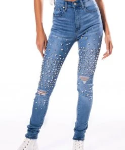 The AKIRA Label Outta This World Rhinestone High Rise Skinny Jeans features a high waist rise, lived-in stone wash, five pocket design, zipper fly button fasten, slight distressing on the knees, and chunky rhinestone and pearl trim detailing. Pair these figure flattering pants with a flowy blouse and square toe sandals.