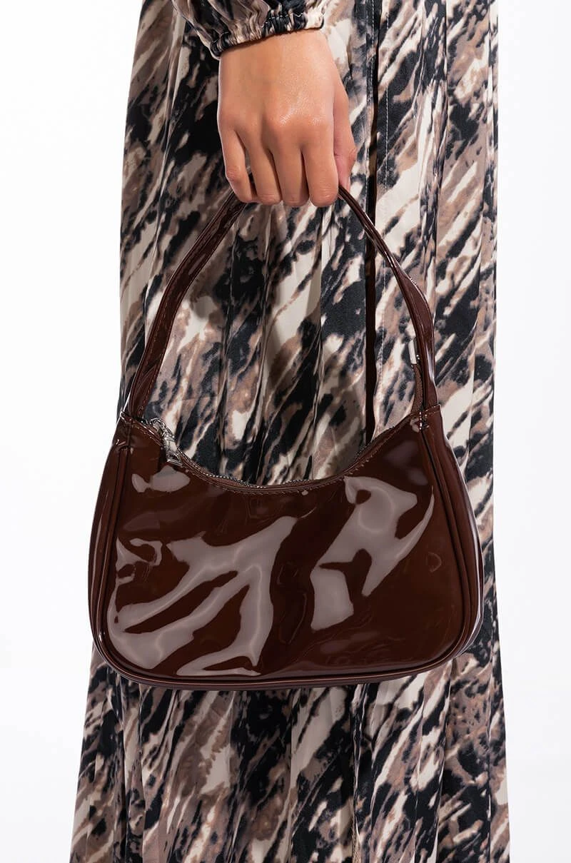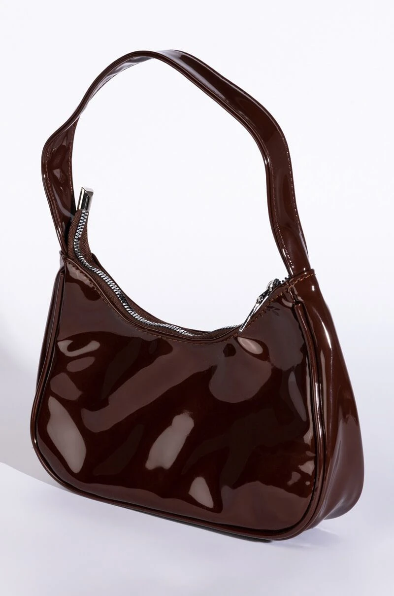The AKIRA Label Patent AF Chocolate Handbag features a glossy patent faux leather base, a chic shoulder strap, a top zipper closure, and a mini baguette silhouette. This versatile piece goes with your entire wardrobe, TBH!