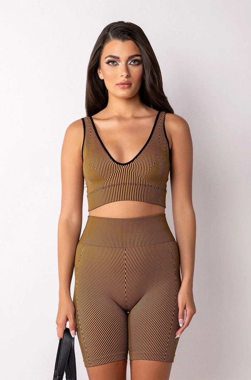 The Paxton Green Light V Neck Bralette is made from a soft knit fabrication and features striped stitch patterning, a rounded V neckline, wide tank straps, padded cups, contrast trim along the neckline and straps, and a wide elastic hem. Pair this piece with the matching Paxton Green Light Biker Shorts and chunky sneakers to finish off your fresh athleisure look.
