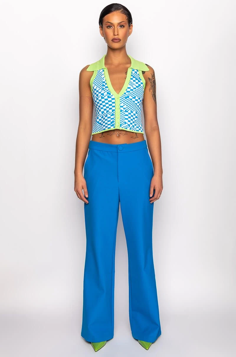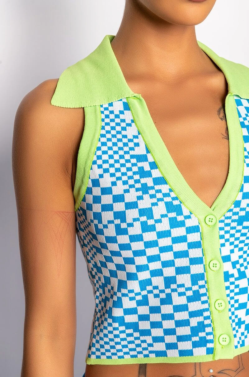 The AKIRA Label Play It Again Cropped Collared Top is made from a stretchy knit fabrication and features a warped geometric pattern, a plunging collared neckline, sleeveless silhouette, cropped length, and front button closures. Pair this piece with wide leg bottoms and booties for a funky fresh casual look.