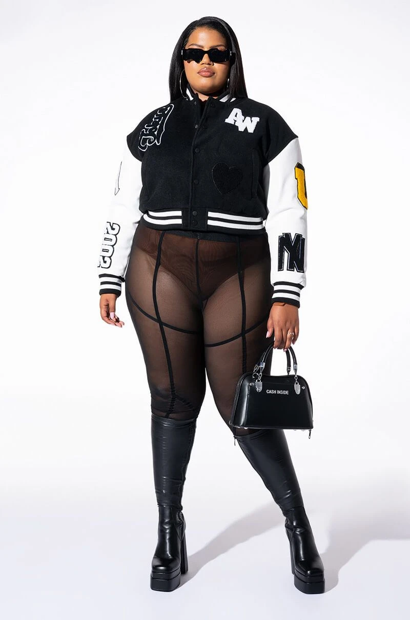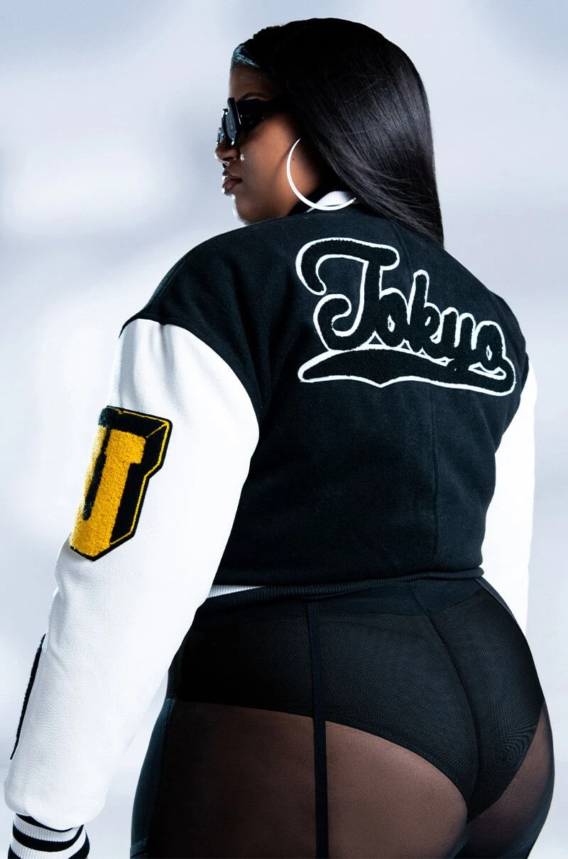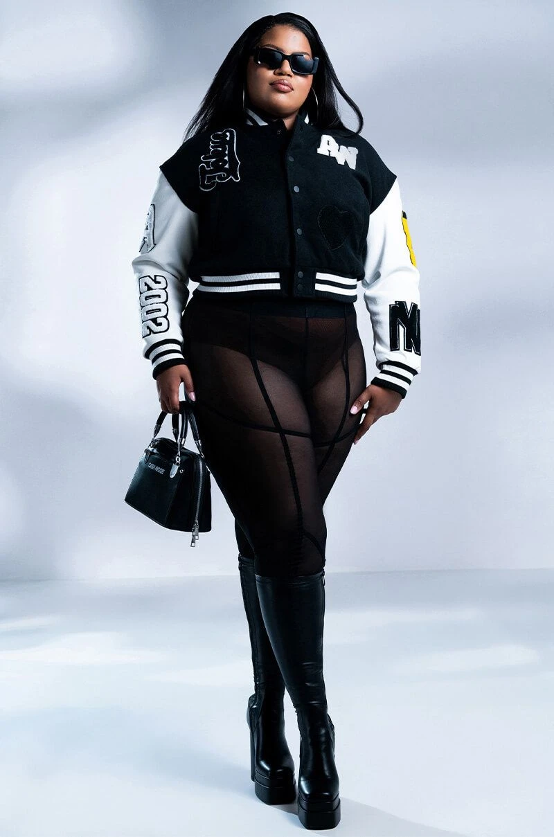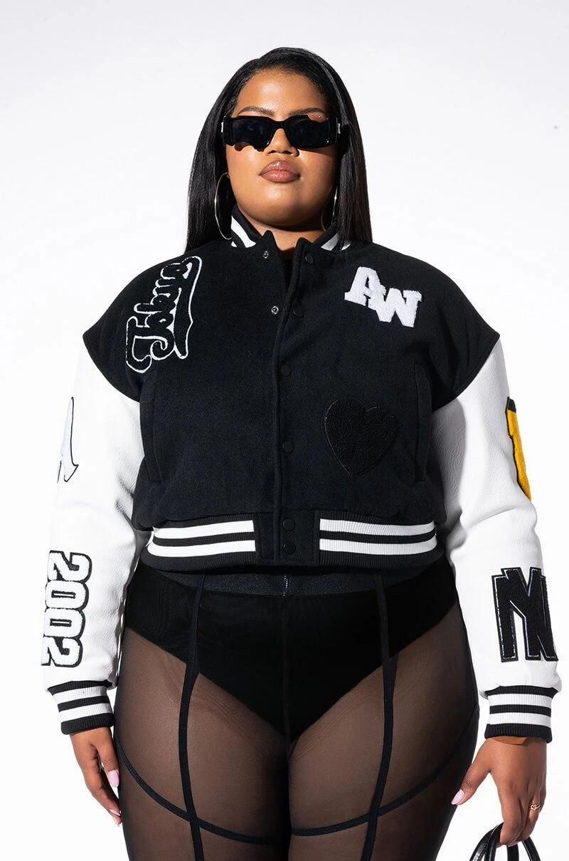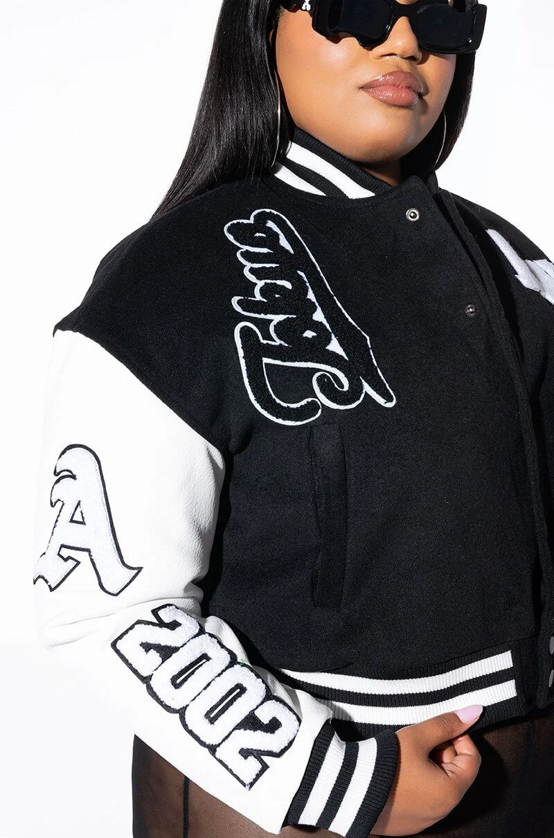 The PLUS AZALEA WANG Keep It Classic Patch Varsity Jacket features a felted knit base, faux leather long sleeves, and textured varsity patches throughout. Patchwork detailing reads “Tokyo,” across the back, “AW,” at the chest, “2002,” “A,” “NY,” and “U,” along the sleeves. Complete with slant side pockets, a quilted inner lining, elastic striped hems, and a snap button up front closure.