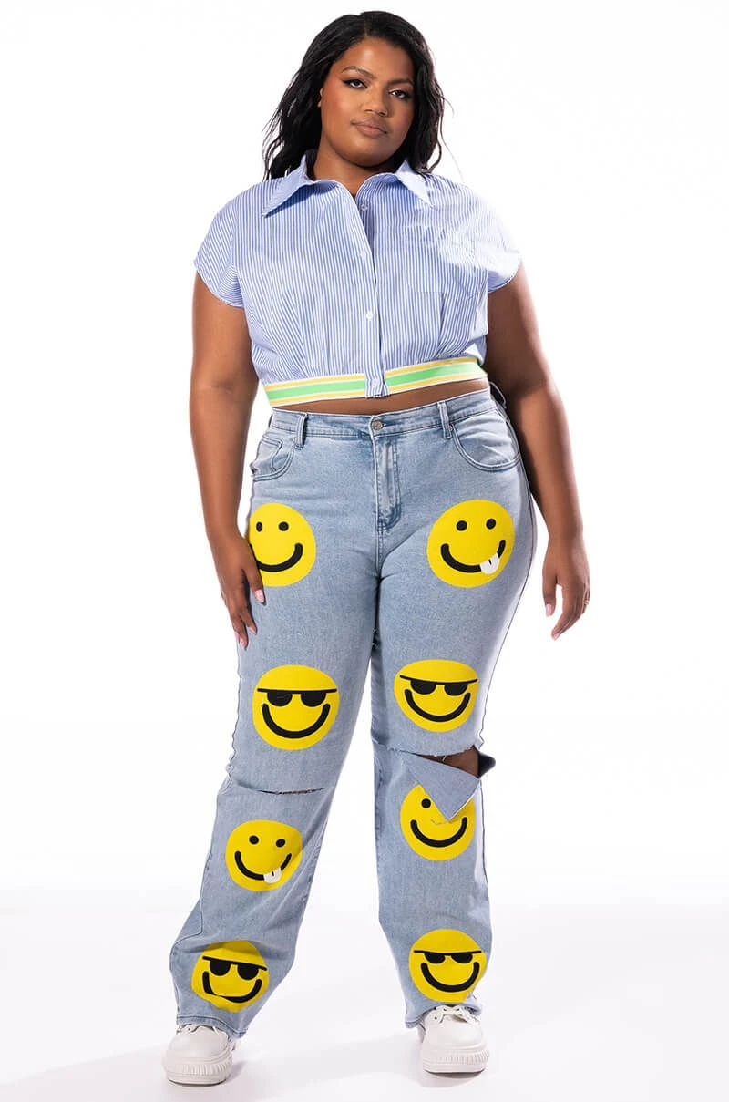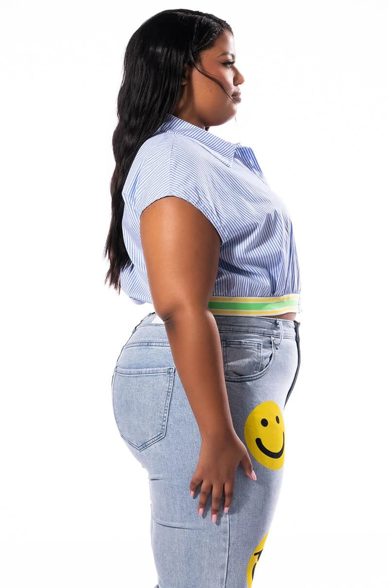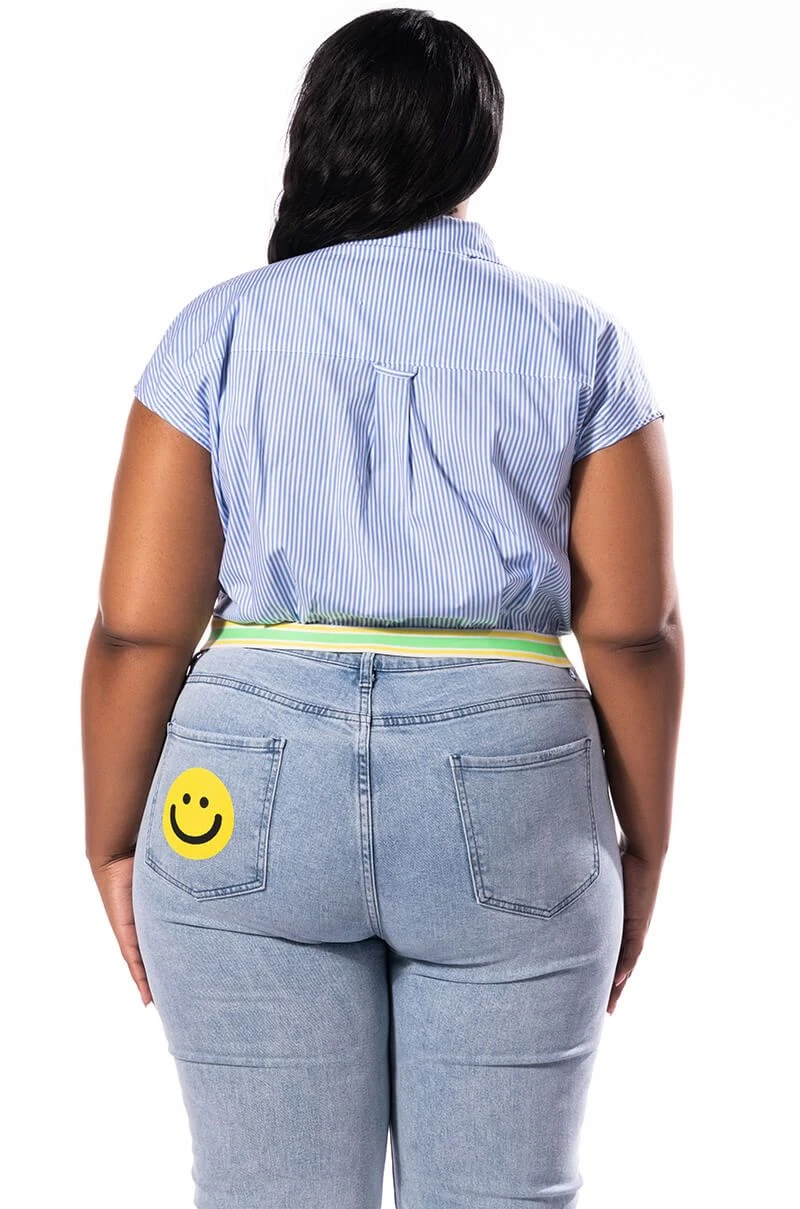 The PLUS AKIRA Label Dirty Martini Cropped Short Sleeve Poplin Blouse is made from a classic cotton shirt fabrication and is complete with a collared neckline, cap sleeves, striped pattern, a chest patch pocket, a thick multicolor elastic waistband, cropped silhouette, and a button up front closure. Pair this piece with flared bottoms for a flirty cocktail hour look!