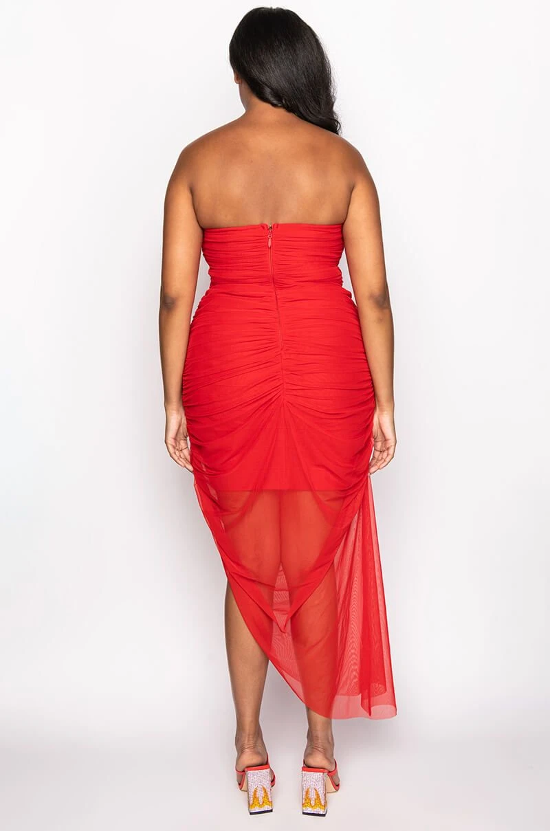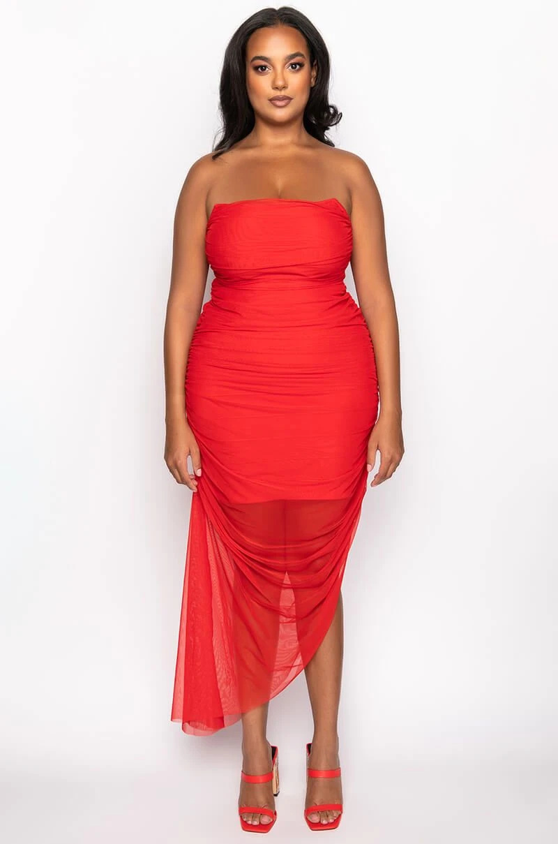 The AKIRA Label Plus Love Me More Tube Ruched Mesh Midi Dress is made from a bandage fabrication tube dress base and is complete with a strapless design, a midi length, ruched side detailing, a sheer mesh overlay with an asymmetrical hem, and a back zipper closure.