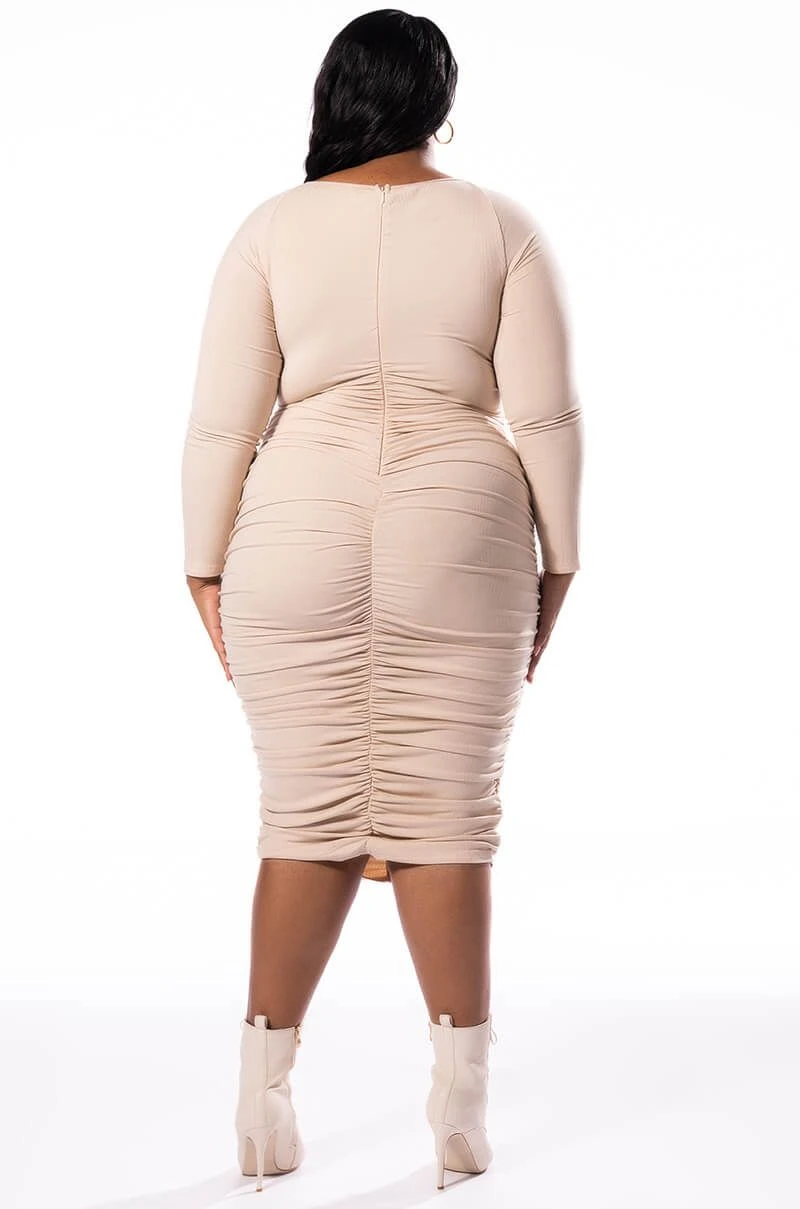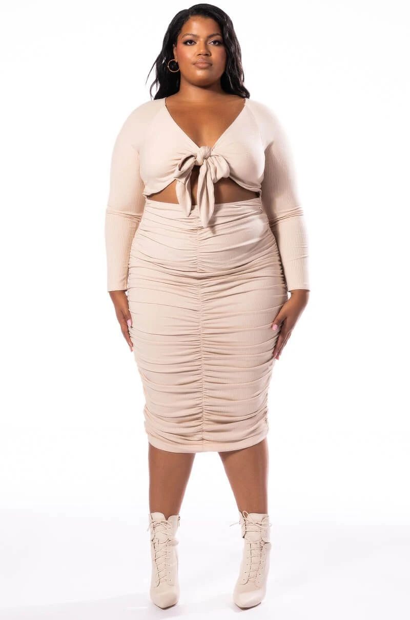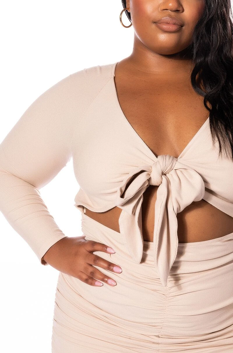 The Plus AKIRA Label What You Want Long Sleeve Midi Dress is made from a ribbed knit fabrication and features a deep v neckline, long sleeves, a tie front detail with torso cut out, bodycon silhouette, midi length, ruching along the body and sides, and a tonal back zipper closure.