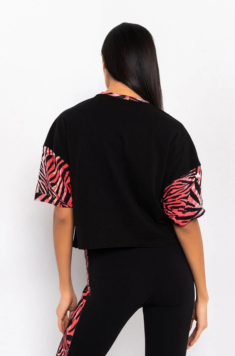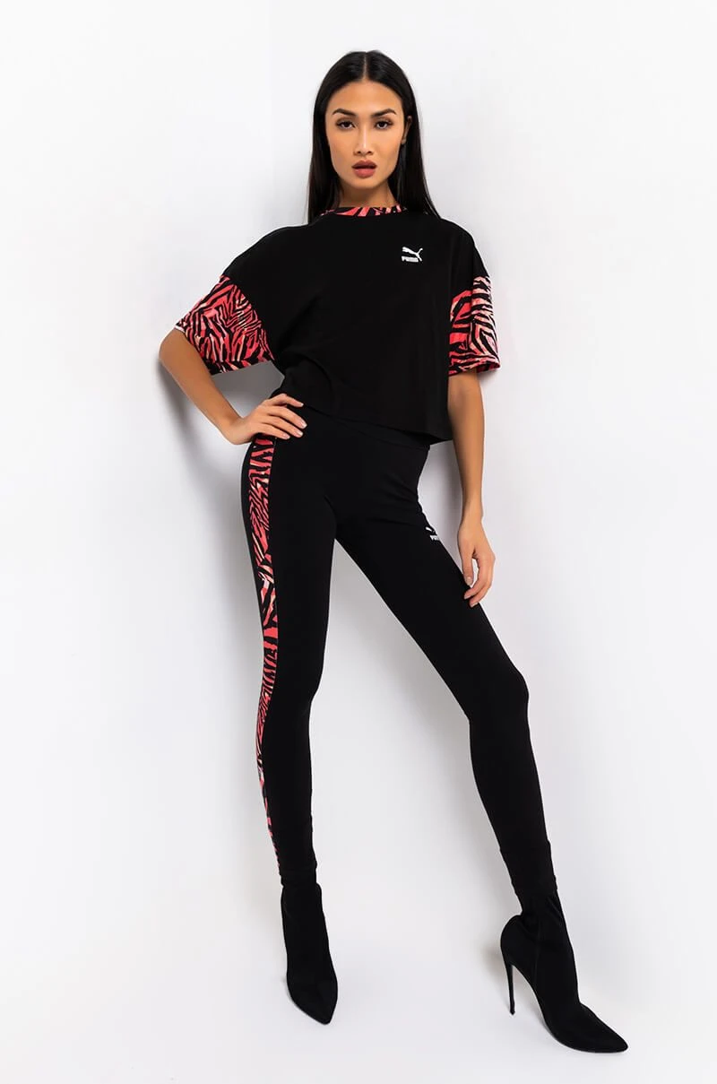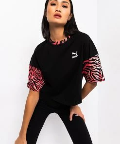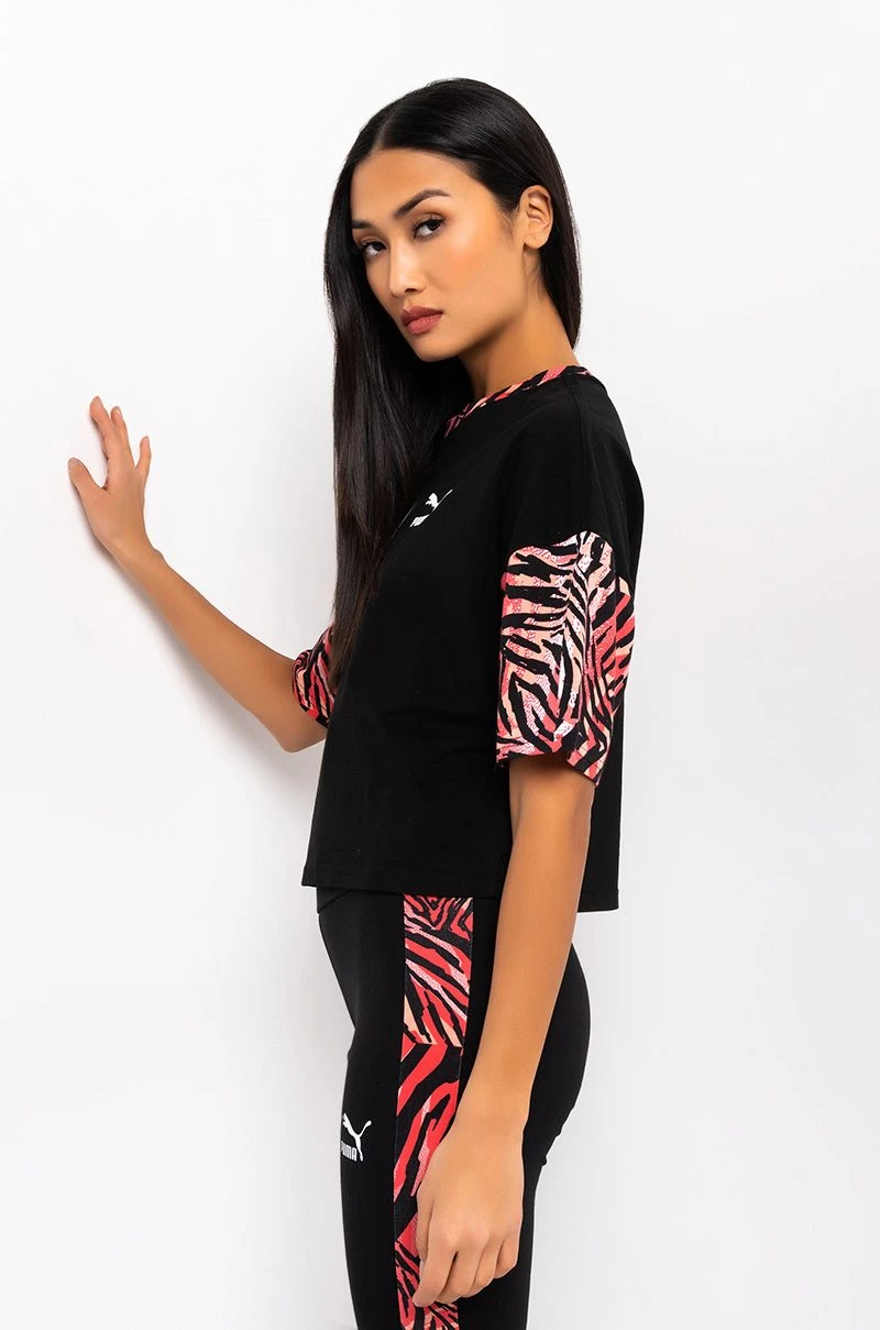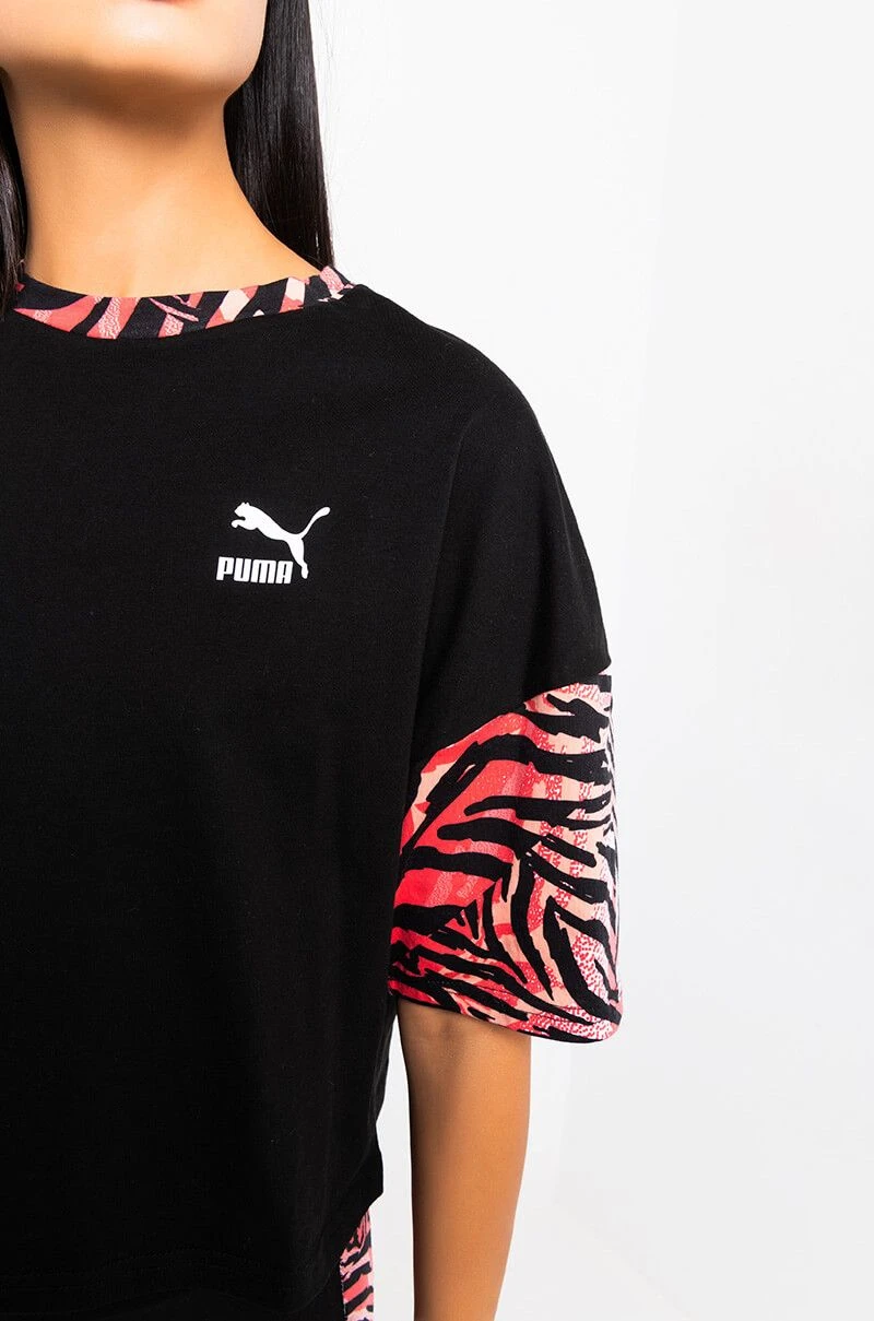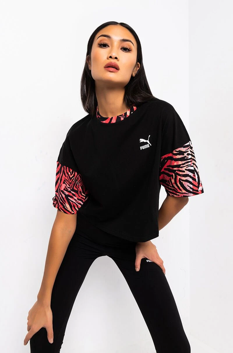Stay home in style in the PUMA Zebra Sleeve Boyfriend Crop Tee. This branded t-shirt features a rounded neckline, short sleeves, a PUMA logo at the chest, a boxy cropped silhouette, patterned trim, and stretchy fabrication. Style it with leggings for a girl-on-the-go look.