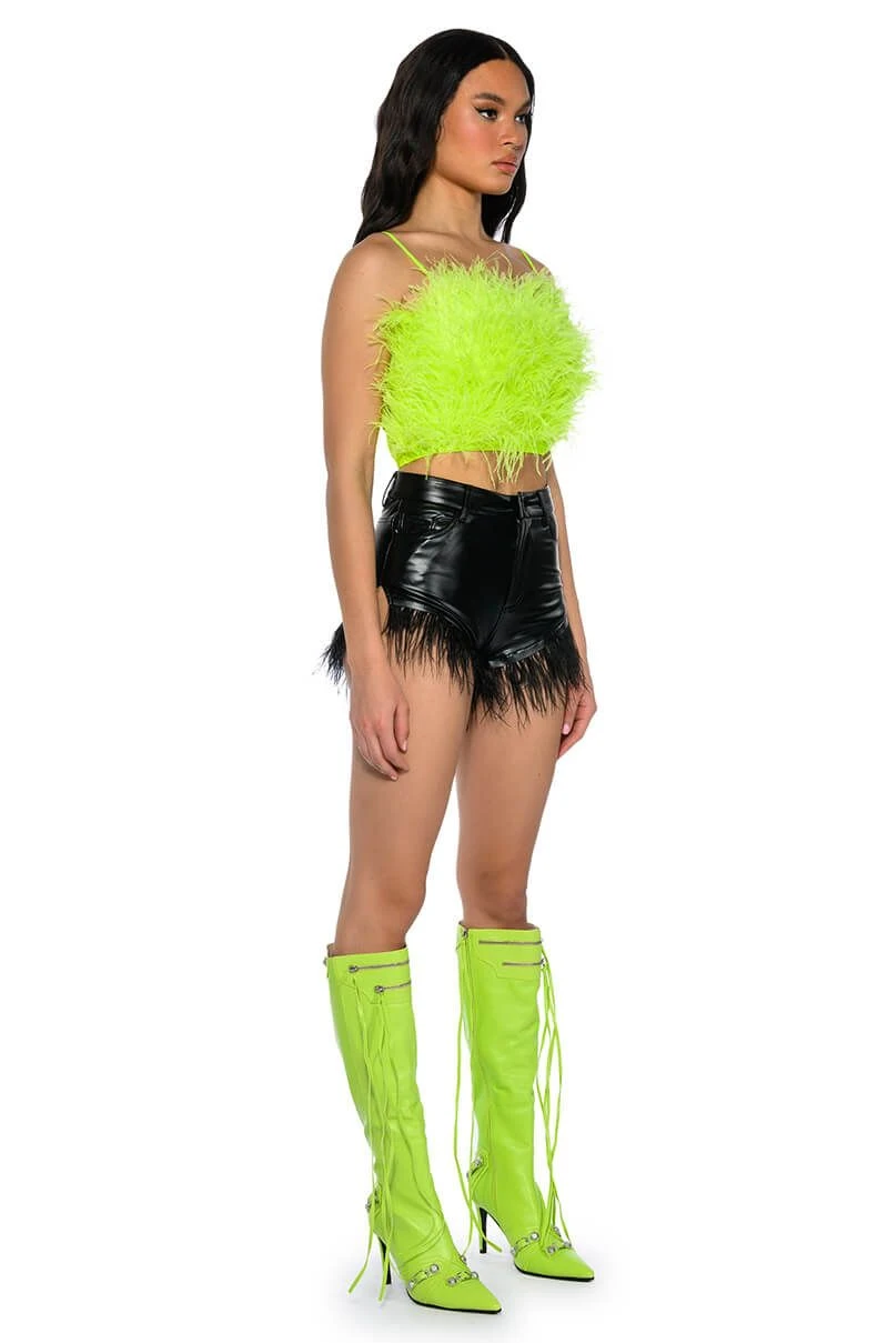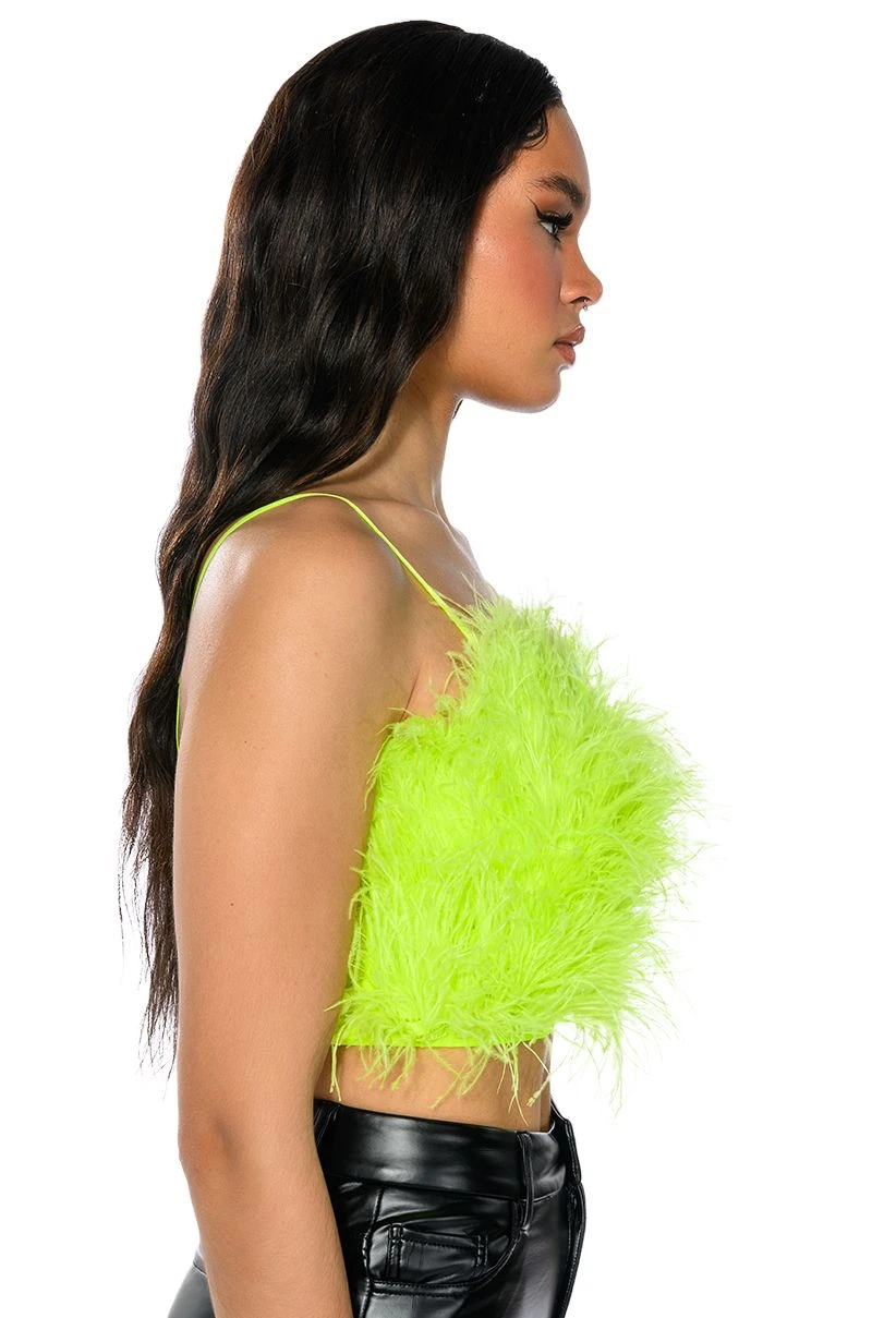 The AKIRA Label Real Ostrich Feather Top is made from a stretchy mesh fabrication and features layered opulent ostrich feathers throughout, a square neckline, adjustable tank straps, and a sleeveless silhouette. Complete with an elastic hem, a cropped length, and an exposed back zipper closure. Pair this piece with satin bottoms and pumps to complete your luxe look.