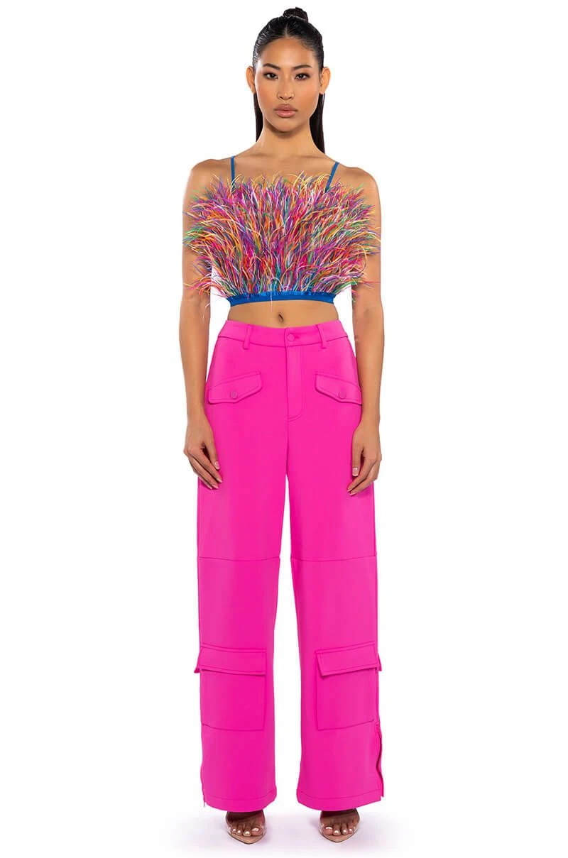 The AKIRA Label Real Ostrich Feather Top In Multi is made from a stretchy, mesh base fabrication and features layered opulent ostrich feathers throughout, a square neckline, adjustable tank straps, and a sleeveless silhouette. Complete with an elastic hem, a cropped design, and an exposed back zipper closure. Pair this piece with satin bottoms and pumps to complete your luxe look.